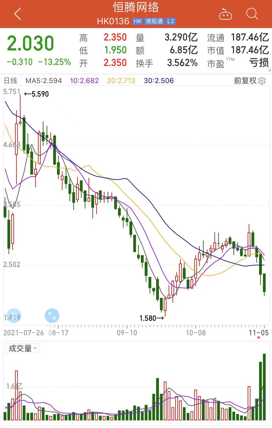 截至11月5日港股收盘,恒腾网络下跌13.25%,报2.03港元/股,总市值为187.46亿港元。