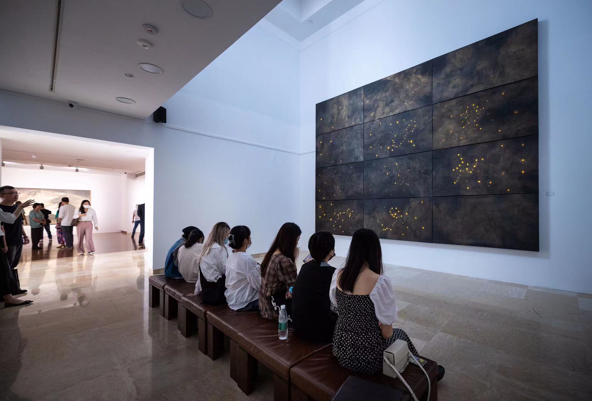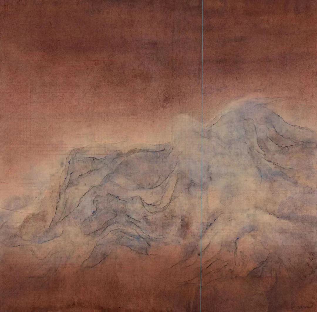 据介绍,2019年8月,王绍强一行去甘肃等地进行了一次人文地理考察,在甘肃的敦煌及张掖等地,亿万年沉积风化形成的彩色山石带给他巨大的震撼。在研究了当地地质博物馆的藏品和文献资料之后,他将这种触动再现于宣纸之上,创作了一批从地理科学角度呈现“心中山水”的作品,星图、方格网、卫星地图标识、水墨材料、山水意象,因此成为了他作品的关键词。