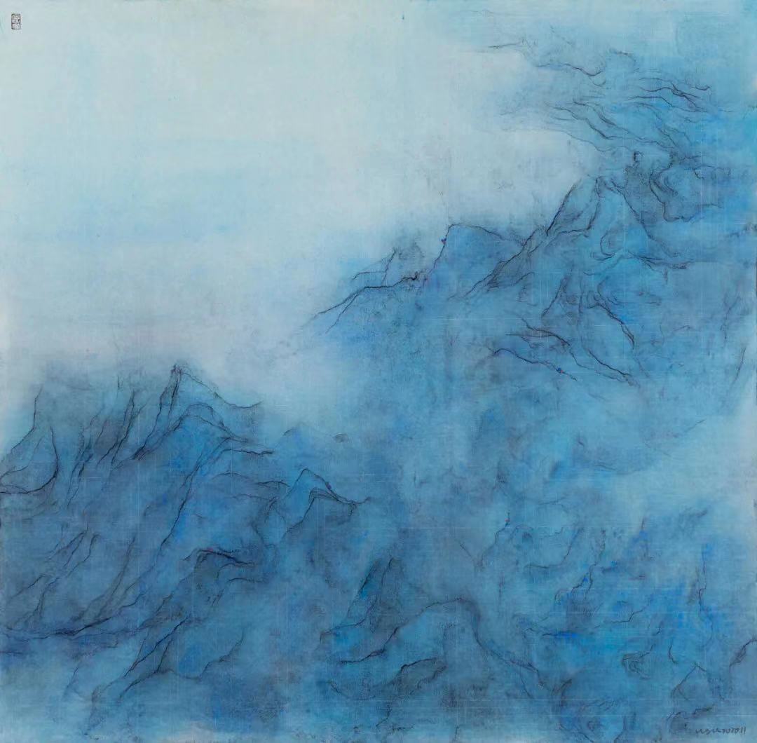 《藏海青雾》《云脉丹霞》等作品就运用了独特的“九宫格”图式,这些网格来源于最古老的中华智慧“河图洛书”。网格与山水的重叠,不仅让观众以“观察者”的身份,从宏观视角俯瞰画中山水,还借此连通了古今,蕴含着王绍强对“古与今”的思考。“希望超越古人‘卧以游之’的逍遥自在,传达一种沧海桑田、世事无常的历史感悟与人生哲思。”王绍强说道。