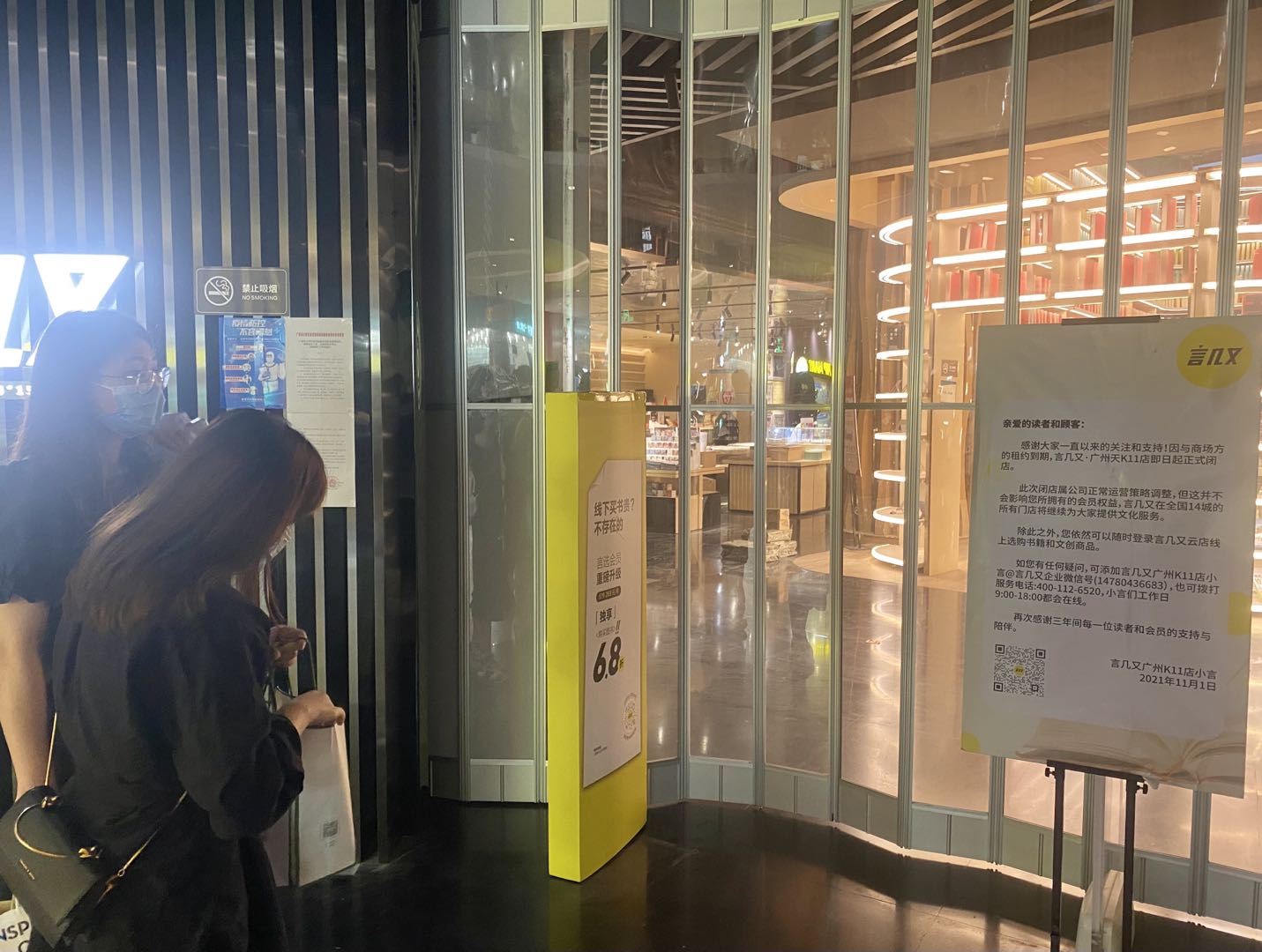 信息时报讯(记者 黄冠柽 见习记者 章乔晖)近日,言几又广州K11店被曝闭店。11月5日,记者到现场走访看到,言几又广州K11店的两处大门已经关上,门前的公告显示书店已正式闭店。现场,店内有几名员工正在清点物资,偶尔有市民、读者前来观望和咨询。
