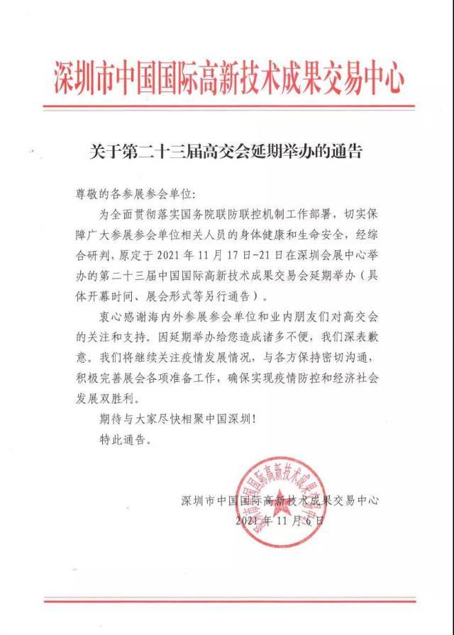 据中国国际高新技术成果交易会(简称“高交会”)官网、微信公众号“高交会”,原定于2021年11月17日至21日在深圳会展中心举办的第二十三届高交会延期举办,具体开幕时间、展会形式等另行通告。