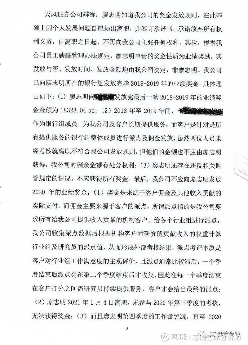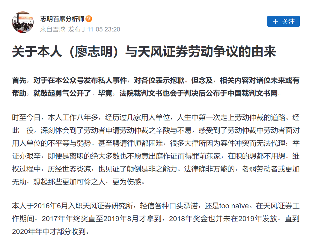 在文章中,廖志明称自己于2016年6月入职天风证券研究所,工作期间,2017年年终奖直至2019年8月才拿到,2018年奖金也并未在2019年发放,直到2020年年中才部分收到。无奈之下,廖志明于2020年12月9日正式提交离职申请,希望离职后能通过法律途径拿回应得的奖金,并于2021年1月4日从天风证券离职。