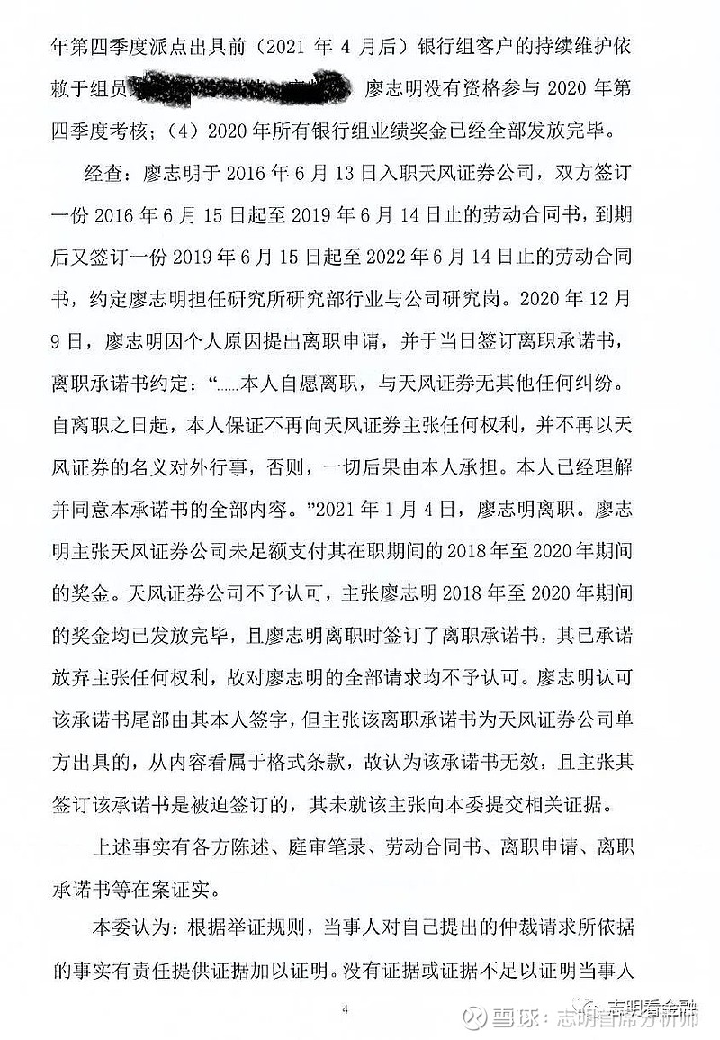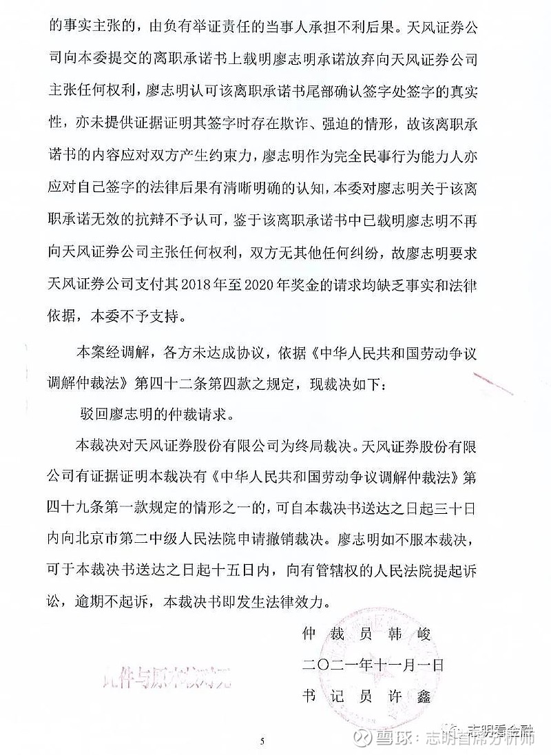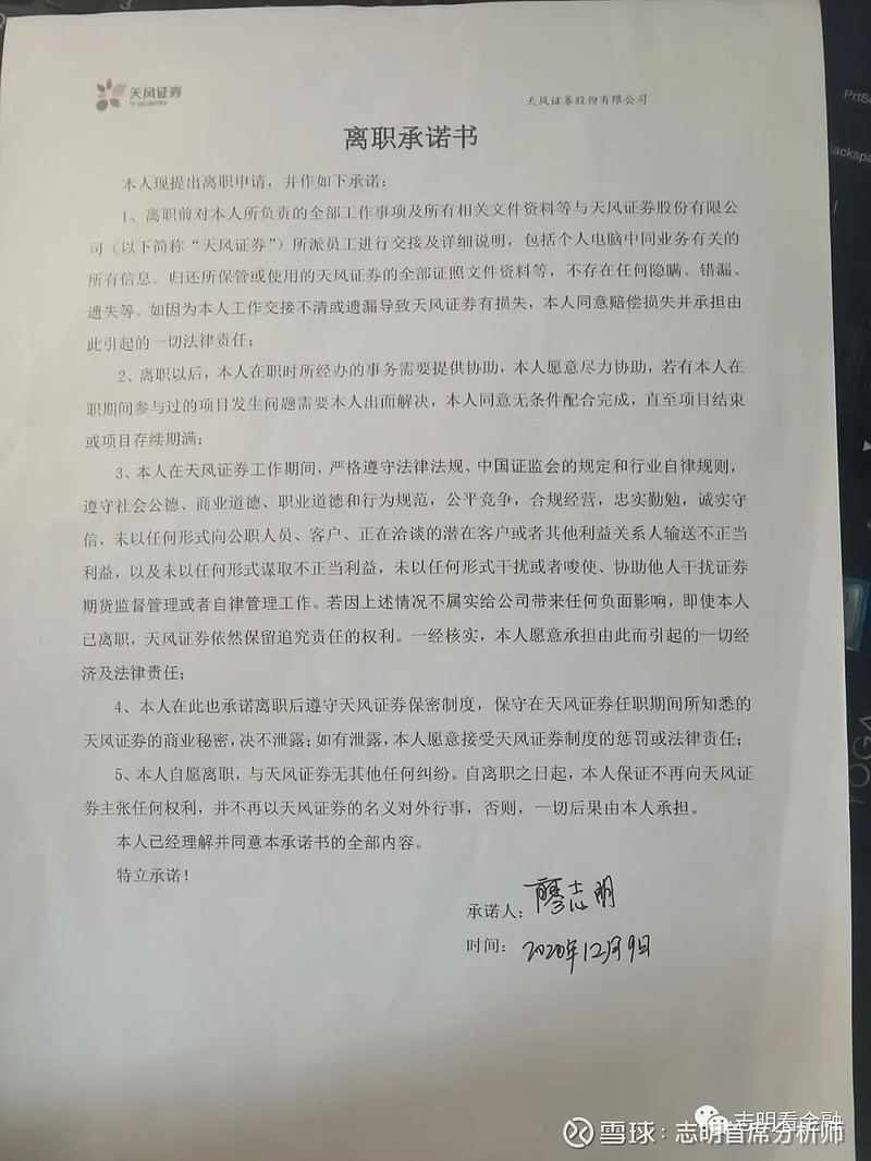 然而,由于廖志明离职时签署了一份《离职承诺书》,其中有“自离职之日起,本人保证不再向天风证券主张任何权利”的条款。