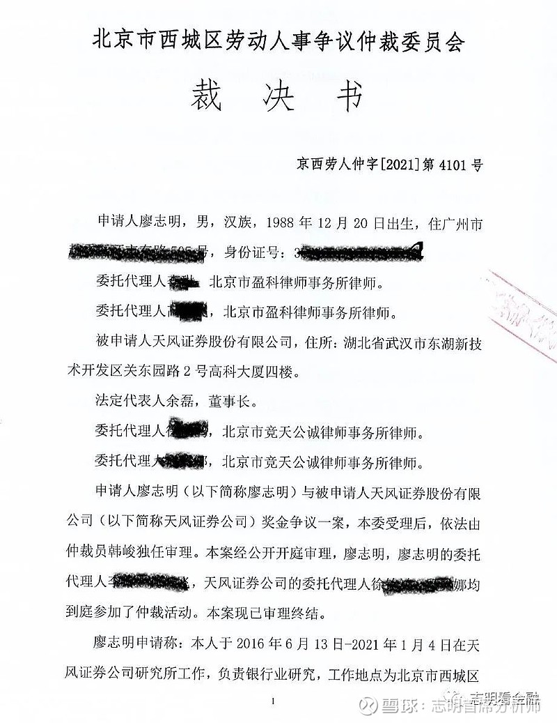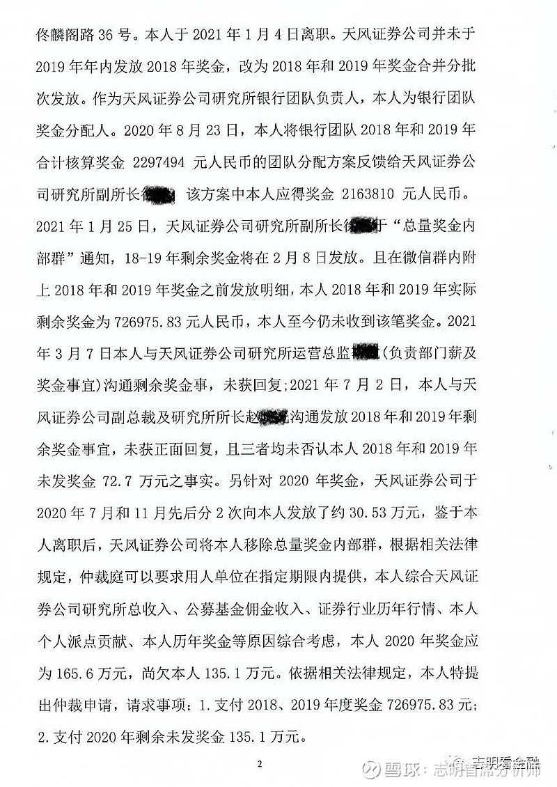 随后,2021年7月中旬,廖志明向北京市西城区劳动争议仲裁委员会申请仲裁,该仲裁案于2021年10月13日开庭。开庭当日,天风证券律师代表将已发的部分奖金主张为全部应发奖金。而廖志明认为,天风证券应当向自己支付2018、2019年度奖金约72.7万元,以及2020年剩余未发奖金135.1万元,二者合计约200余万元。