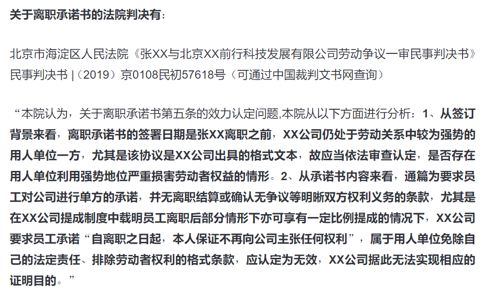 值得注意的是,廖志明在文章中附上了另外两份关于《离职承诺书》的法院判决,而在这两起案件中,对于公司出具的《离职承诺书》中包含的“自离职之日起,本人保证不再向公司主张任何权利”条款,法院认为,该条款属于用人单位免除自己的法定责任、排除劳动者权利的格式条款,应认定为无效。