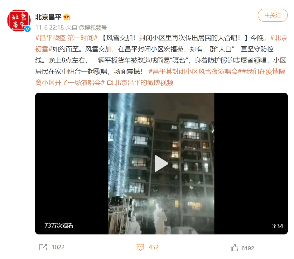 近几日,他们白天帮着配送物资,晚上则开着货车,在社区不同区域内举行小型流动演唱会,为封闭在家中的居民送上歌声。