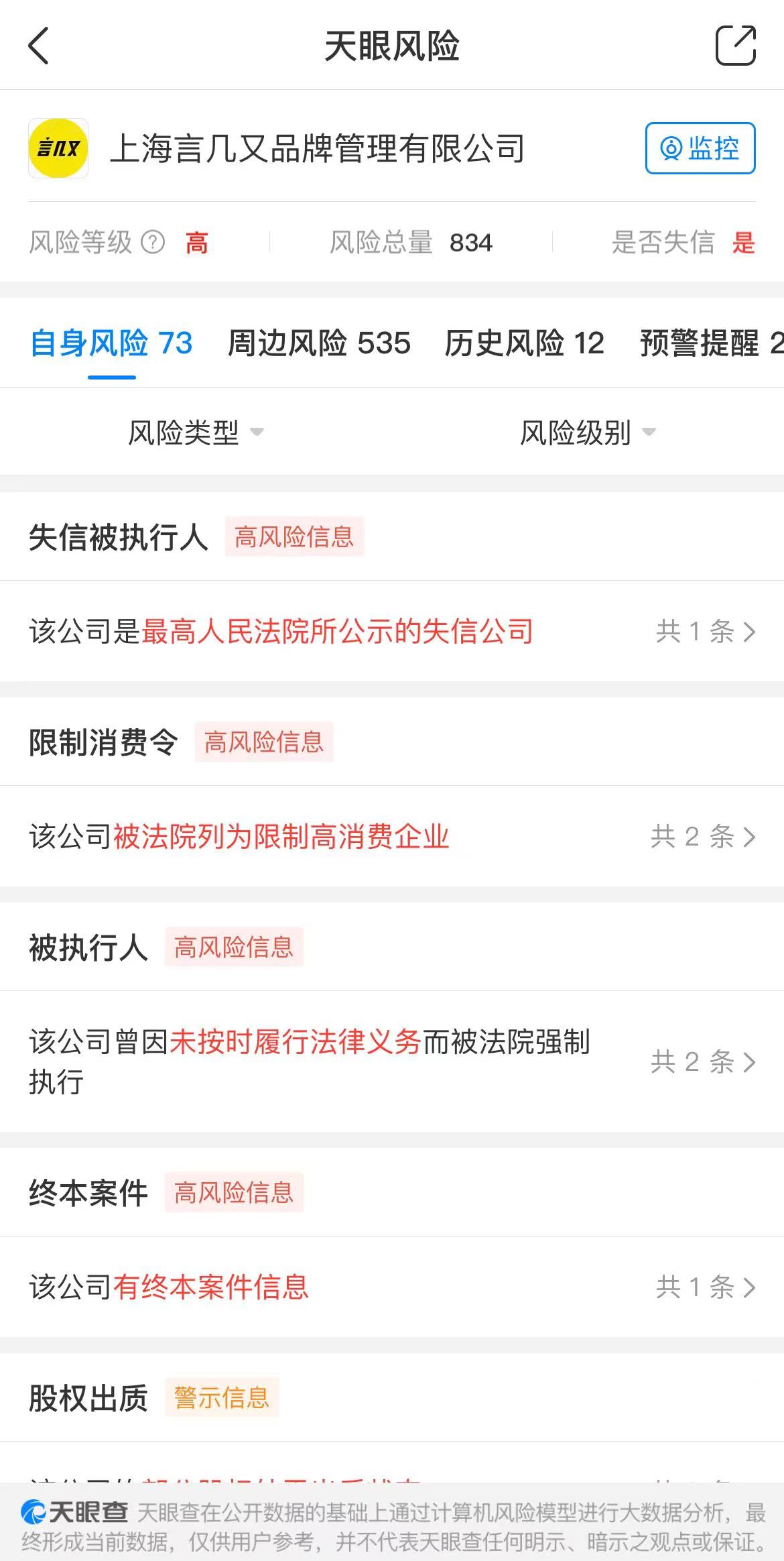 通过天眼查App,记者注意到,言几又官网显示的四川言几又文化传播有限公司法定代表人显示为但捷,持股股东为上海言几又品牌管理有限公司,持股比例达100%。而上海言几又品牌管理有限公司当前已被列为“高风险企业”,风险类型包括“是最高人民法院所公示的失信公司”“被法院列为限制高消费企业”和“曾因未按时履行法律义务而被法院强制执行”等,被执行总金额共计370.676万元。