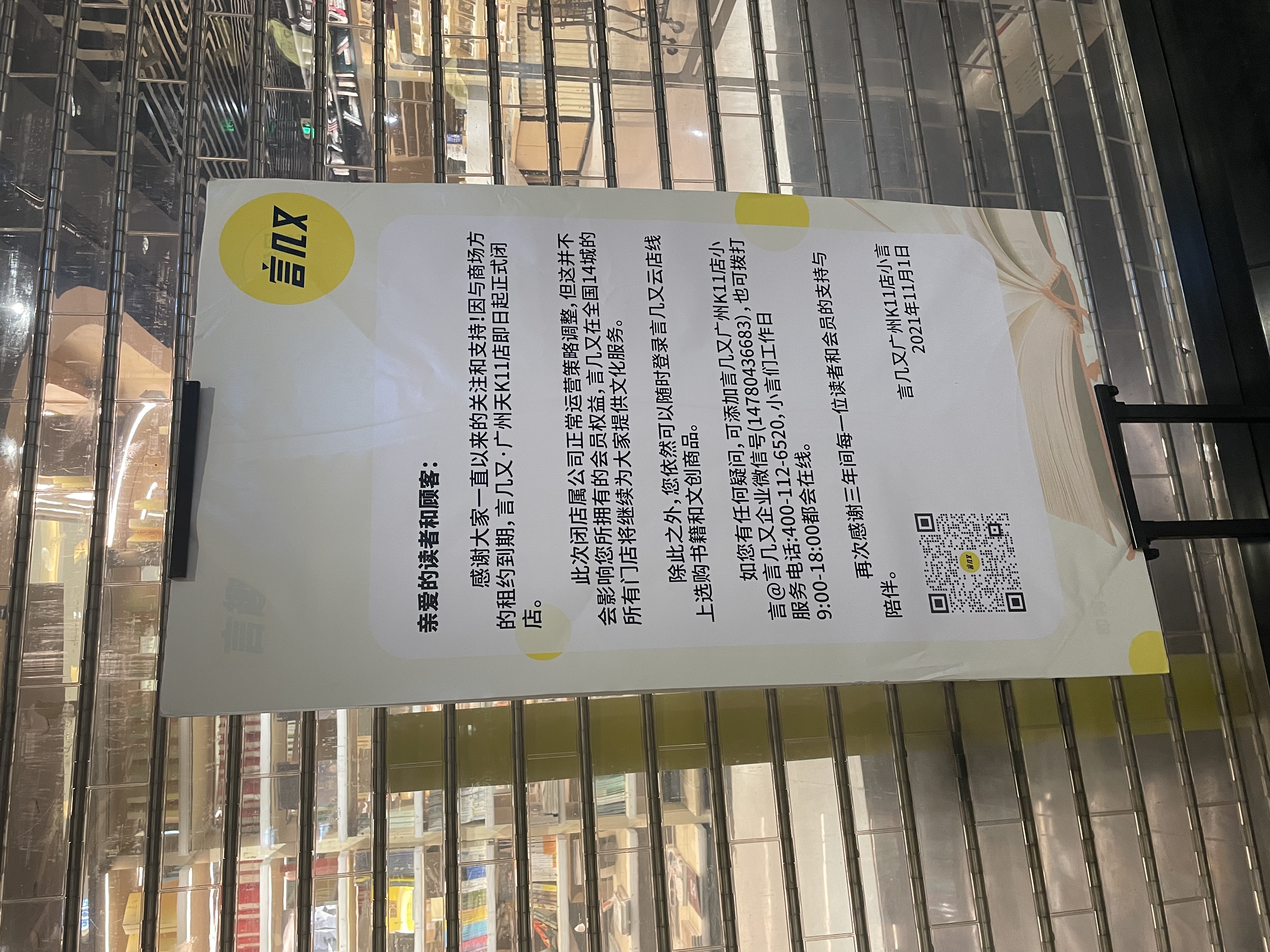 门口,落款日期为11月1日的大幅告示显示,“因与商场方的租约到期,言几又·广州K11店即日起正式闭店”,并称“此次闭店属公司正常运营策略调整,并不会影响所拥有的会员权益”;隔着虚掩的门帘看店内,略显昏暗的灯光照映着地上大小不一的纸箱,店内几名工作人员一边整理书籍,一边为前来的会员解决售后问题,颇现落寞。