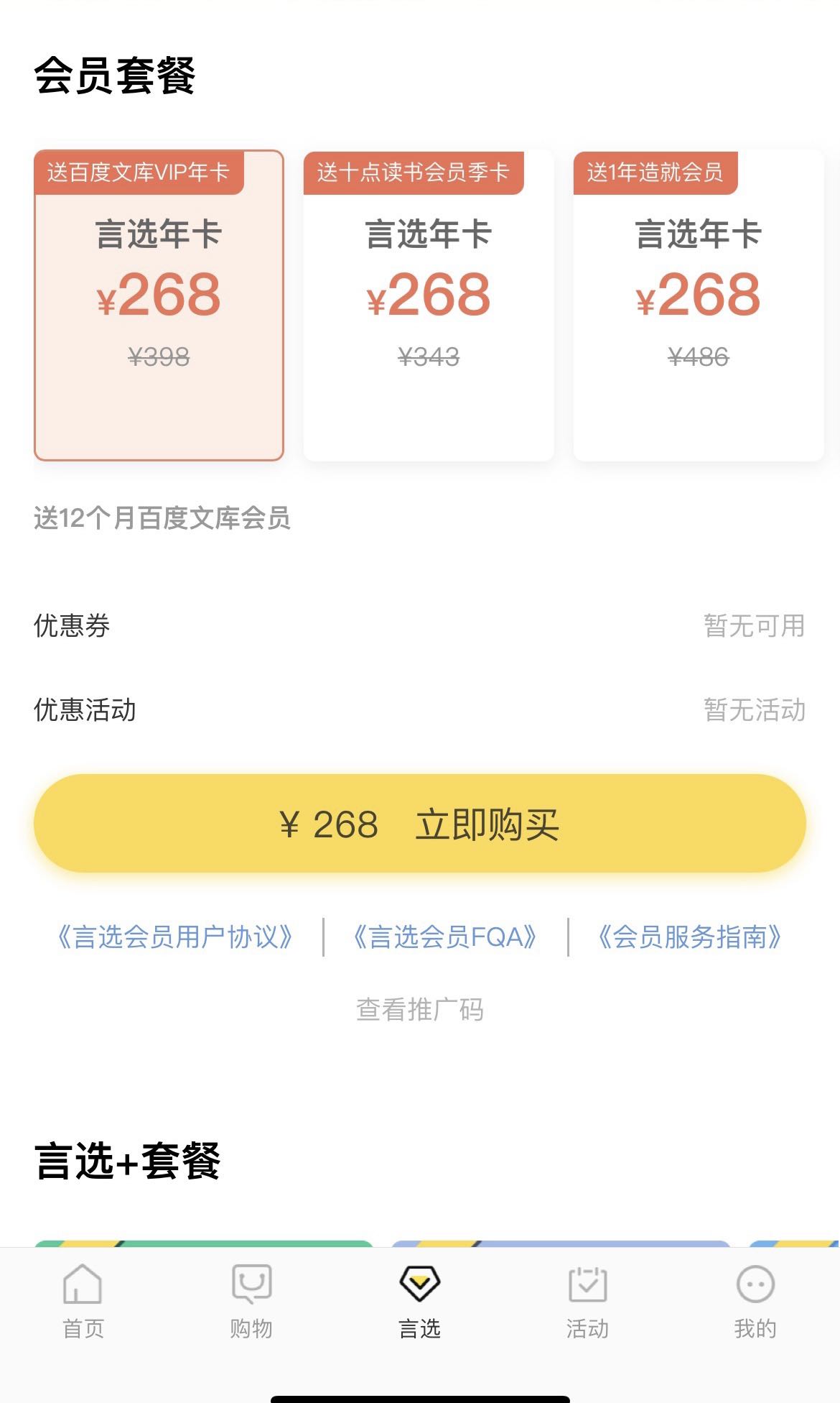 有关报道显示,受疫情影响,言几又2020营业额出现下滑。2月21日,言几又发出一封“这个春天,言几又需要你”的“家书”,动员“言氏青年”会员充值,更联合饿了么共同推出线上“精神食粮补充站”,配送时效从原来的次日达,提至半小时同城配送。记者打开言几又小程序,了解到当前开通“言选年卡”成为会员需要268元,购卡后可以享受购书68折优惠和产品、饮品85折优惠并免费参加活动等福利。