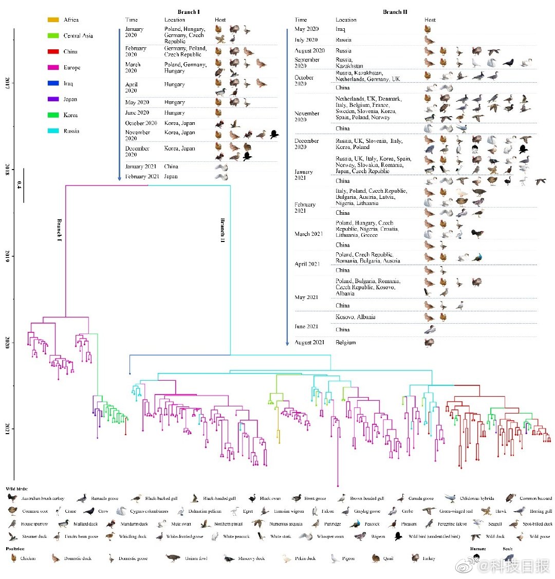 H5N8亚型禽流感病毒对家禽业杀伤力巨大,陈化兰院士团队围绕科学防控H5N8禽流感疫情对此展开研究。该研究团队在2020年9月至2021年6月间采集并分析了41172份家禽拭子样品和317份野鸟样品,分离到36株H5N8病毒,其中22株来自野鸟,14株来自鸭和鹅。这些病毒分为两种基因类型,溯源发现第一种类型病毒于2021年1月由天鹅传入中国;第二种类型病毒也是由天鹅传入我国,随后传播给我国境内16种野鸟和一些地区的鸭和鹅。