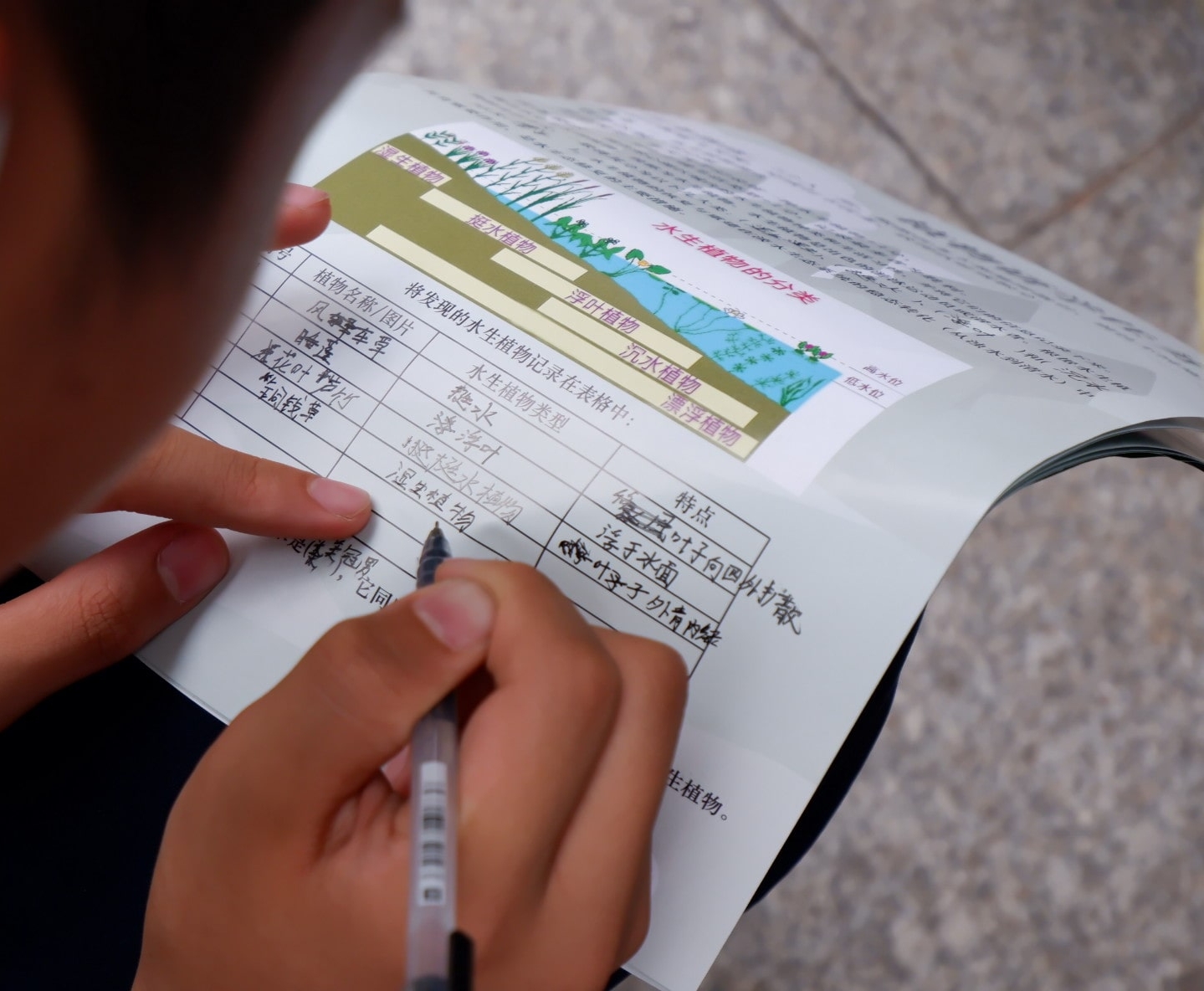 “趴在那株植物上的粉色的一坨,是福寿螺的卵,我在乡下的时候见到过。”一位五中学生给身边的同学介绍。她对动植物很感兴趣,从小就经常阅读这方面的科学课外书,回乡下的时候也格外关注动植物,许多知识记到现在。