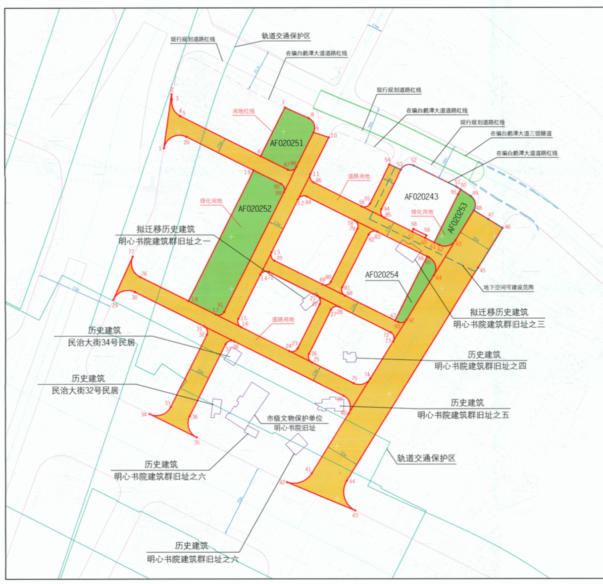 规划道路实施涉及明心书院建筑群旧址之一、明心书院建筑群旧址之三,共两栋历史建筑。按照经市政府批准的《新隆沙ー陆居路片区(荔湾区AF0201、AF0202规划管理单元)控制性详细规划和城市设计深化》中的《新隆沙陆居路片区城市设计深化历史文化遗产评估专章》,该两栋历史建筑需实施迁移。