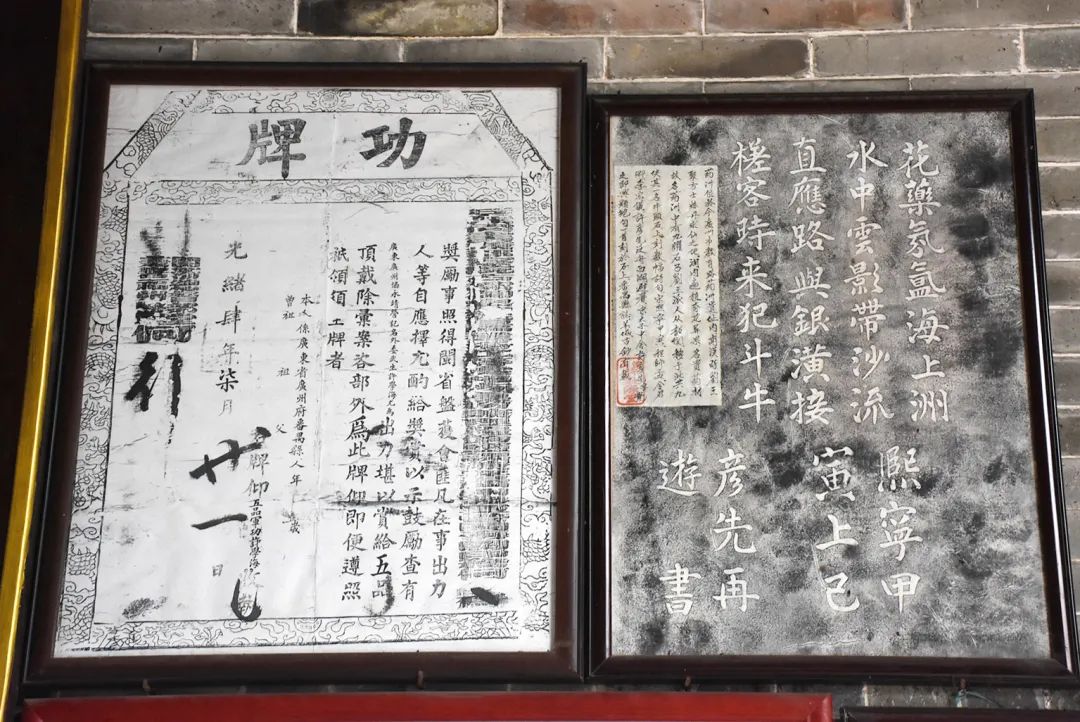 ▲右边为拓印诗句。在今广州市教育路药洲遗址,许彦先曾即兴写诗并刻于石上,如今依旧保存着,许氏后人拓印后挂于祠堂内。