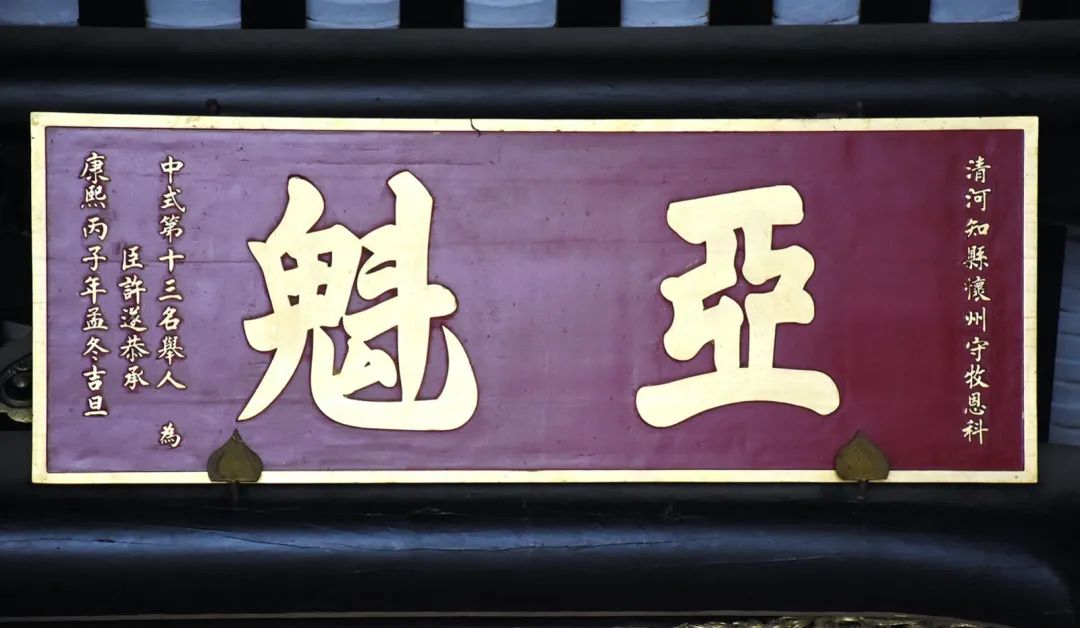 而在“银青光禄大夫”右边的木匾“魁亚”,上面刻着“清河知县怀州守牧恩科”“中式第十三名举人 为臣许遂恭承”。该功名匾的主人是许遂,康熙丙子举人,他对潭山村的贡献如今依旧被村民津津乐道。