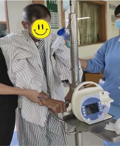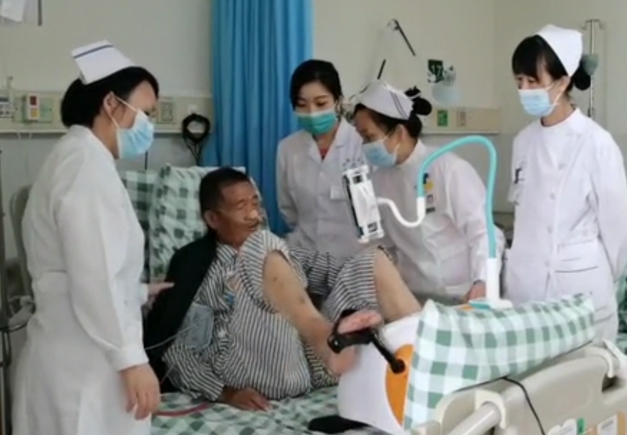 借助这套床边活动系统进行运动康复训练,张老伯锻炼肌力,提高下床的能力。在多个科室的救治下,经过多日的训练,张老伯终于可以下床缓慢走动了。