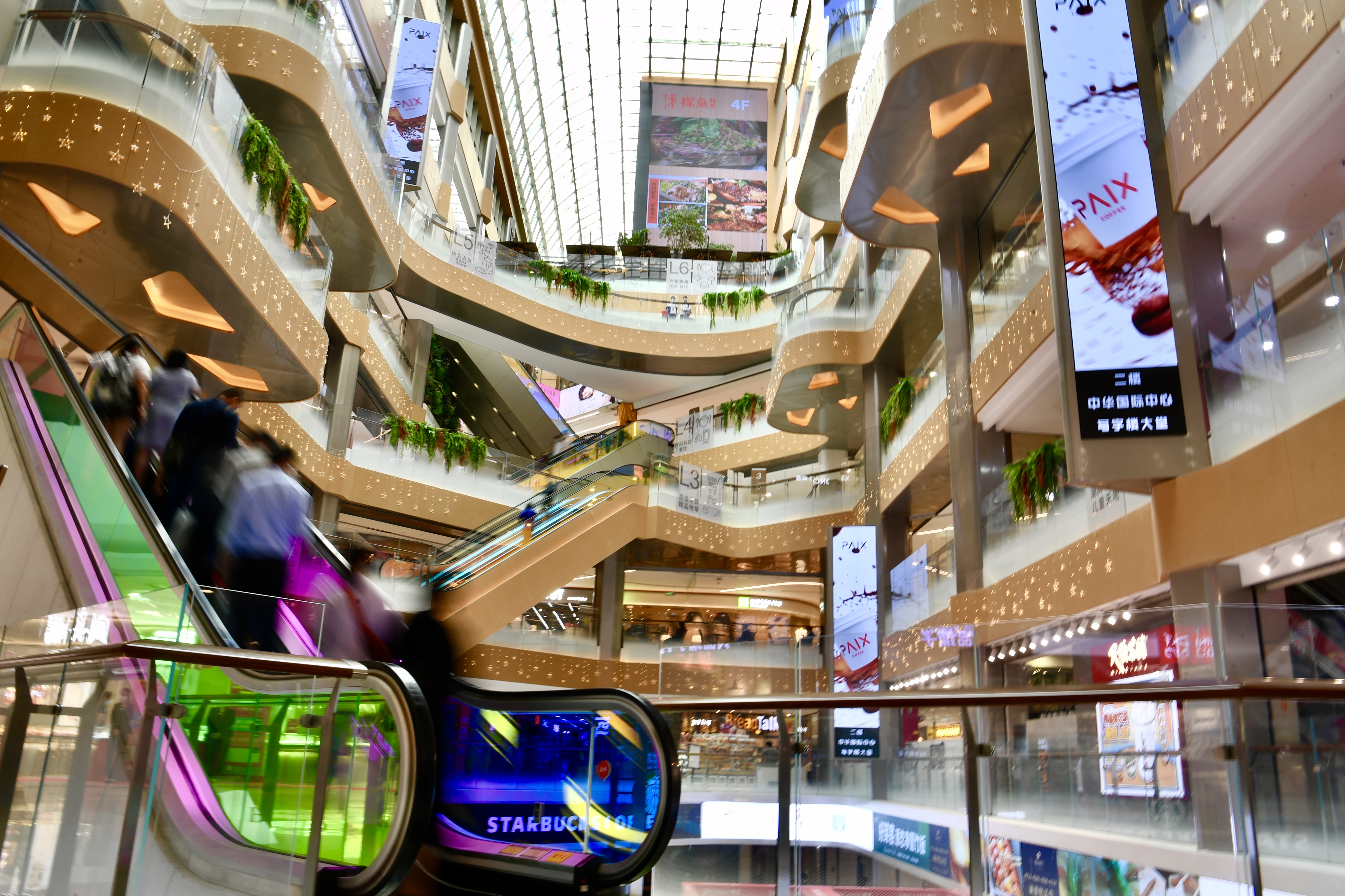 走到四楼的科技数码主题楼层,经过升级,各品牌门店变得更为明亮大气,给消费者提供了更多消费选择。此外,商场内的电影院也经过升级改造,变身为“魔法城”打卡点;全新中华广场以“珍贵的宝石”为设计理念,借助彩虹玻璃等材料的晕染,光线折射出鲜明丰富的层次感;空间中引入自然绿植,使商场成为繁华闹市中开辟的一方绿洲。