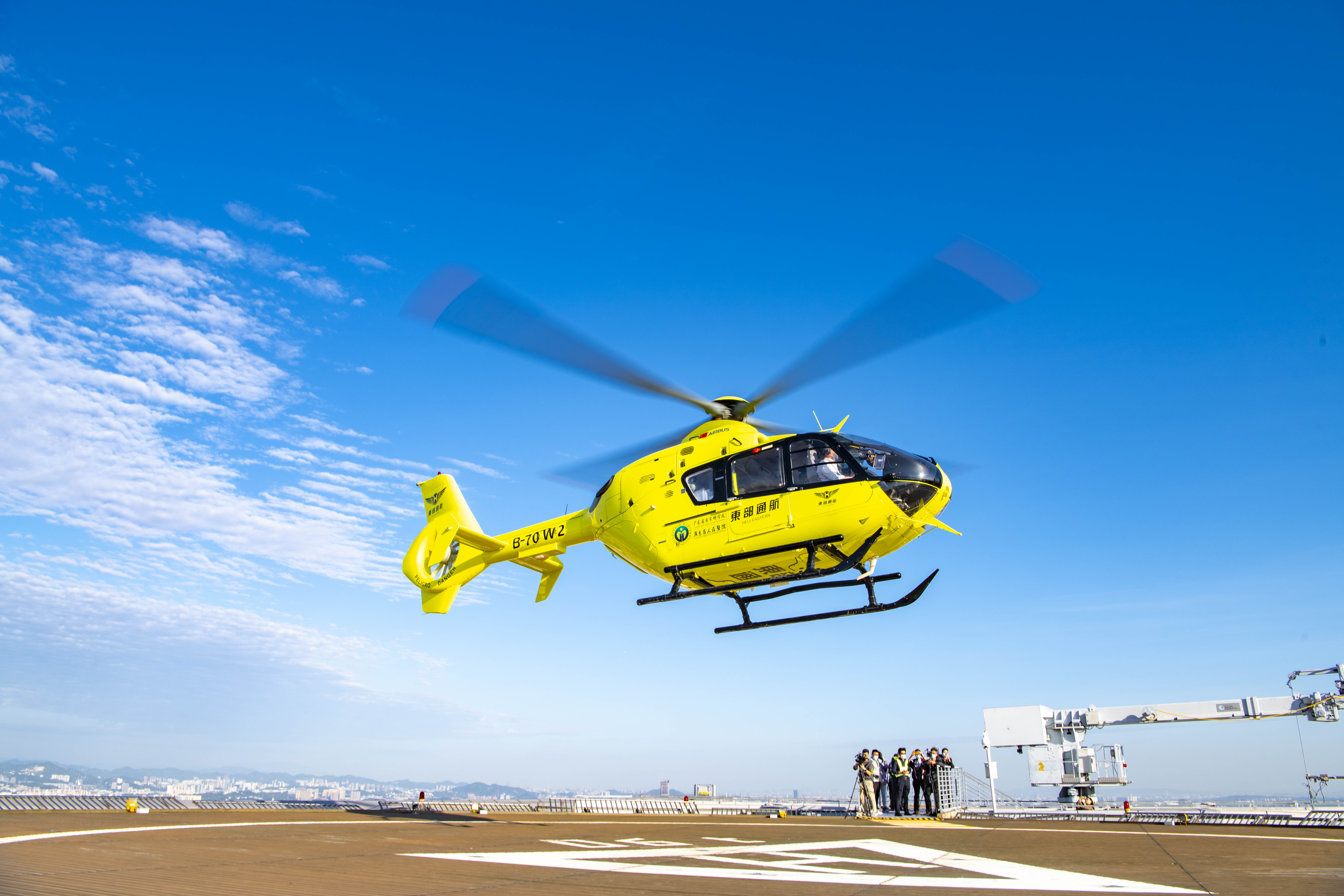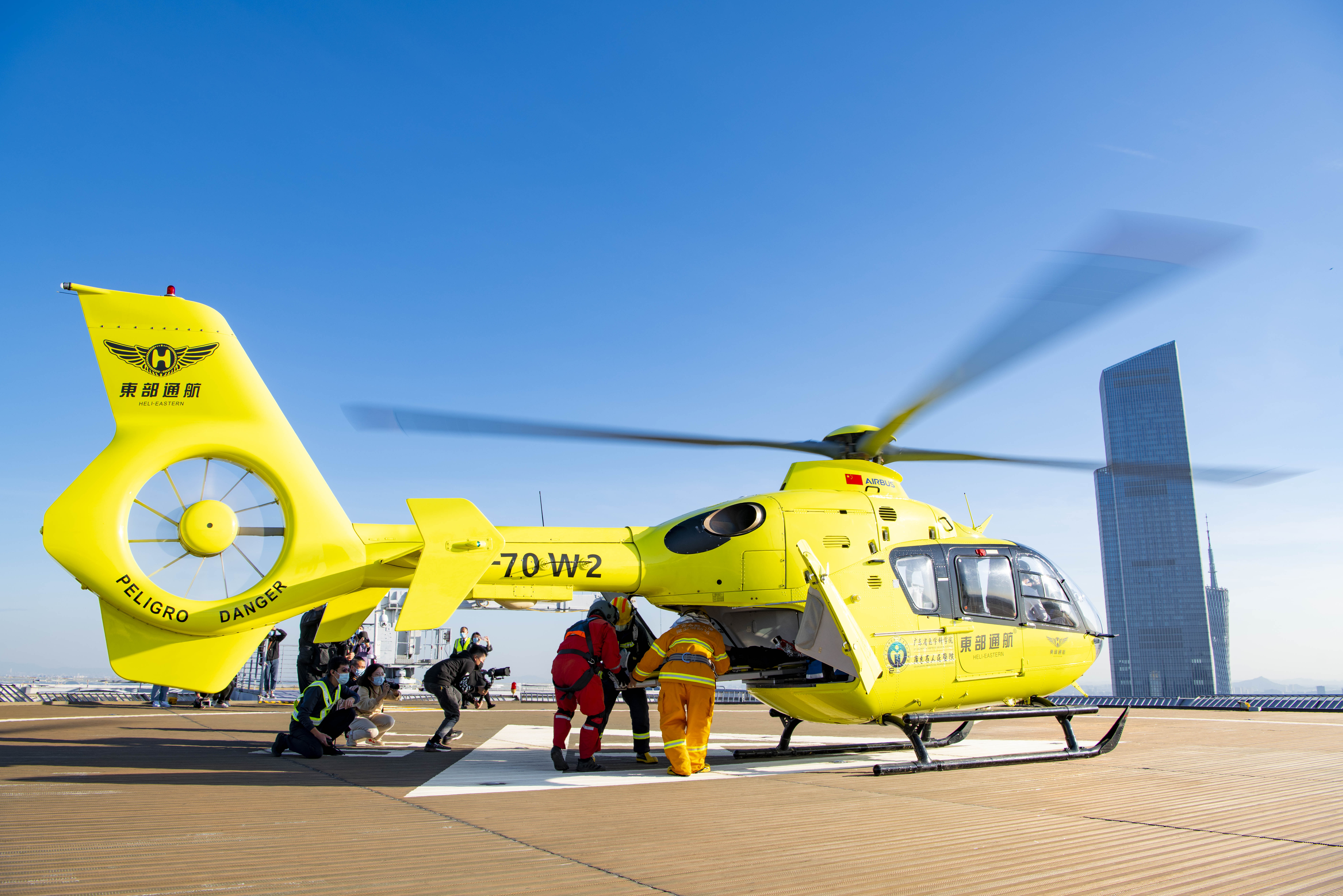 东部通航在接报后,立即启动空中救援机制,派出H135型救援直升机,不到15分钟便迅速到达越秀金融大厦停机坪。
