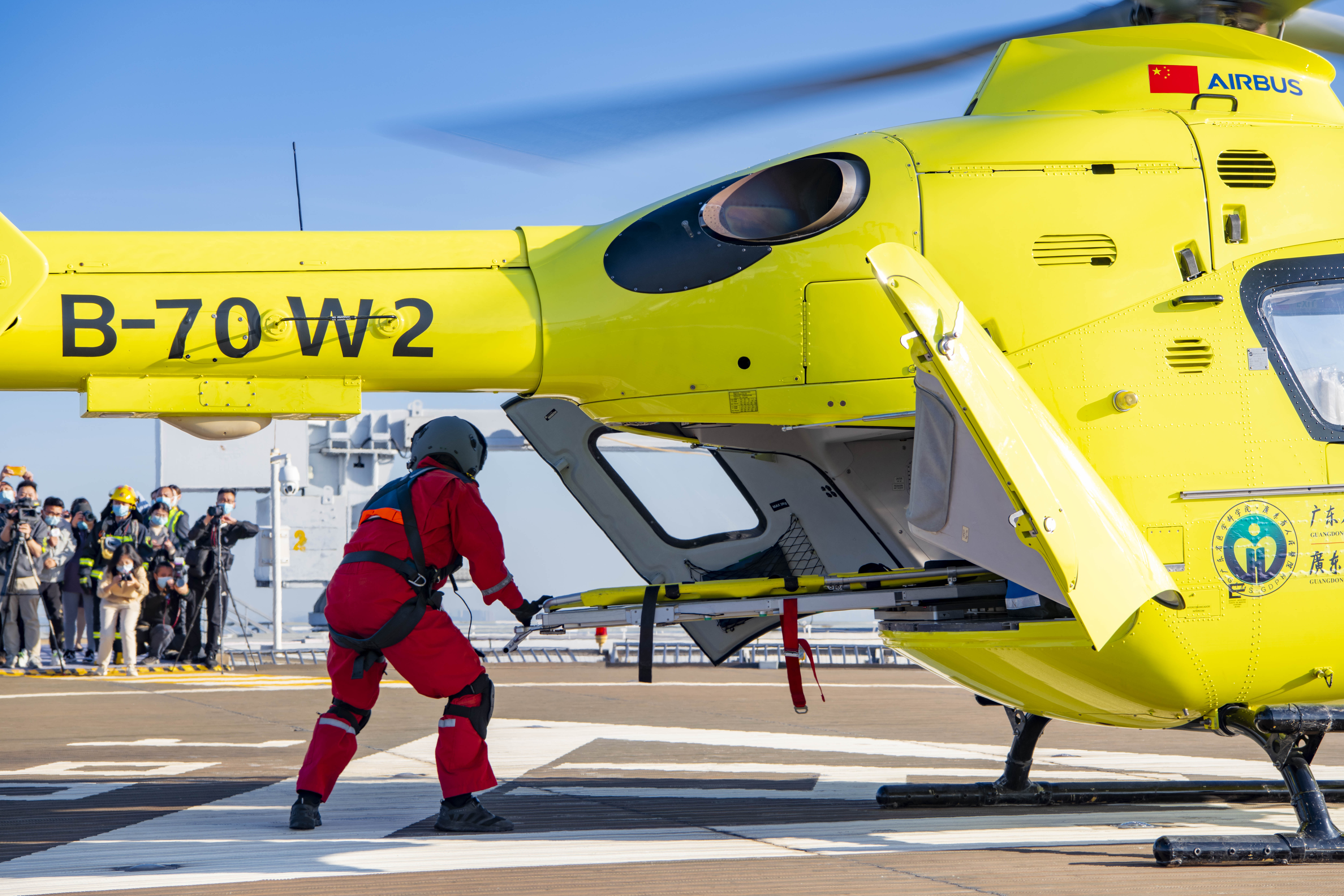 救援直升机到达现场后,现场救援疏散队与东部通航救援人员把伤员抬上直升机,起飞5分钟后,直升机顺利降落在广东省人民医院停机坪,医院医护人员迅速将伤者送至急救室进行抢救。