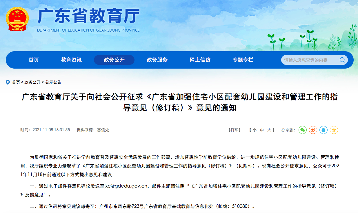 11月8日,广东省教育厅公布《广东省加强住宅小区配套幼儿园建设和管理工作的指导意见(修订稿)》(以下简称《配套园意见》)和《广东省普惠性民办幼儿园认定、扶持和管理办法(修订稿)》(以下简称《普惠园办法》),并向社会公开征求意见。