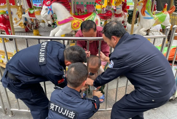 11月5日11时许,清新分局巡警大队民辅警在清新美林广场武装巡逻动中备勤执勤点巡逻时,有一名群众前来求助,称在美林广场门前的儿童游乐场,有一小孩头部被护栏卡住,请求帮助。