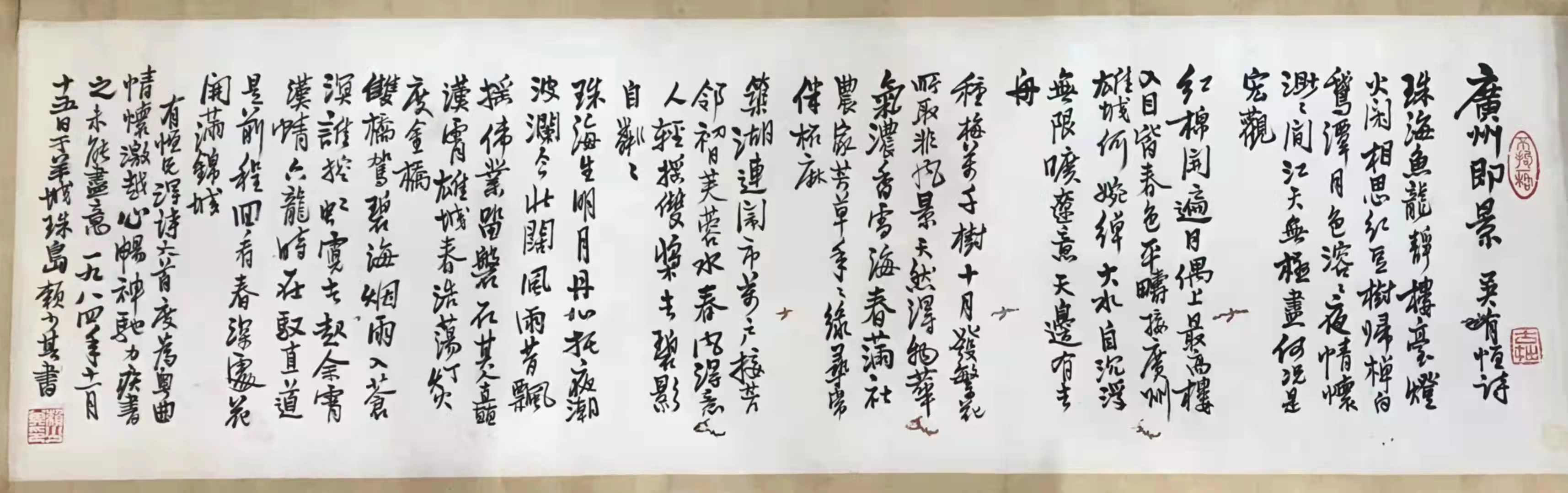 赖少其书法远承《爨宝子碑》《爨龙颜碑》,近法“扬州八家”里的金冬心,方笔如削,字字都给人以峭拔苍稳的感觉。本次展出的一幅赖少其书法作品“录吴有恒广州即景诗六首”,不仅彰显其独特书风,而且还铭刻着两位革命者历经磨难的深厚情谊。“广州即景诗六首”作者是吴有恒,20世纪30年代,吴有恒和赖少其曾一起积极参加革命学生运动,他们合作在中山大学出版墙报,赖少其画漫画,吴有恒配文字。跨越近半个世纪后,两位当年并肩作战的革命战友又一起合作了。此时人间已换了新颜,吴有恒以诗六首咏羊城的美丽祥和,赖少其题跋道:......情怀激越,心畅神驰,力疾书之,未能尽意。一个以诗寄情深,一个以书抒豪情,“录吴有恒广州即景诗六首”作品背后的故事悠长感人。
