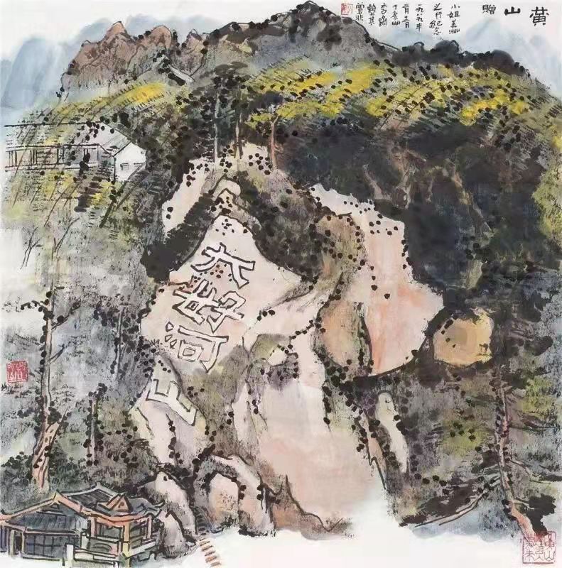 赖少其钟情于黄山题材的山水创作,源自于他与黄山结缘长达半个多世纪的深厚感情。赖少其1939年10月在皖南参加新四军,初涉新安山水,初识黄山面貌,为保卫美丽河山和家园浴血奋战。1959年2月赖少其调任安徽省委宣传部副部长,长期兼任安徽省文联主席和省美术家协会、省书法家协会主席,他经常带领画家们去黄山、九华山、新安江畔、徽乡古村落体验生活和写生创作,并将黄山作为永久创作基地,始作黄山客,亦为黄山友,终成“黄山山中人”。他虽然于1986年定居广州,但后来几回安徽,数上黄山,“日行梦里在黄峰”。本次展览中的一幅《黄山》作品,笔墨既体现赖少其雄浑朴茂、生机灿然的代表性风格,更有匠心处理。赖少其在此作的前景——黄山的一面悬崖陡壁处作留白处理,用双钩书深情地题写下四个大字:大好河山,作品的穆静感和崇高感赫然凸显。