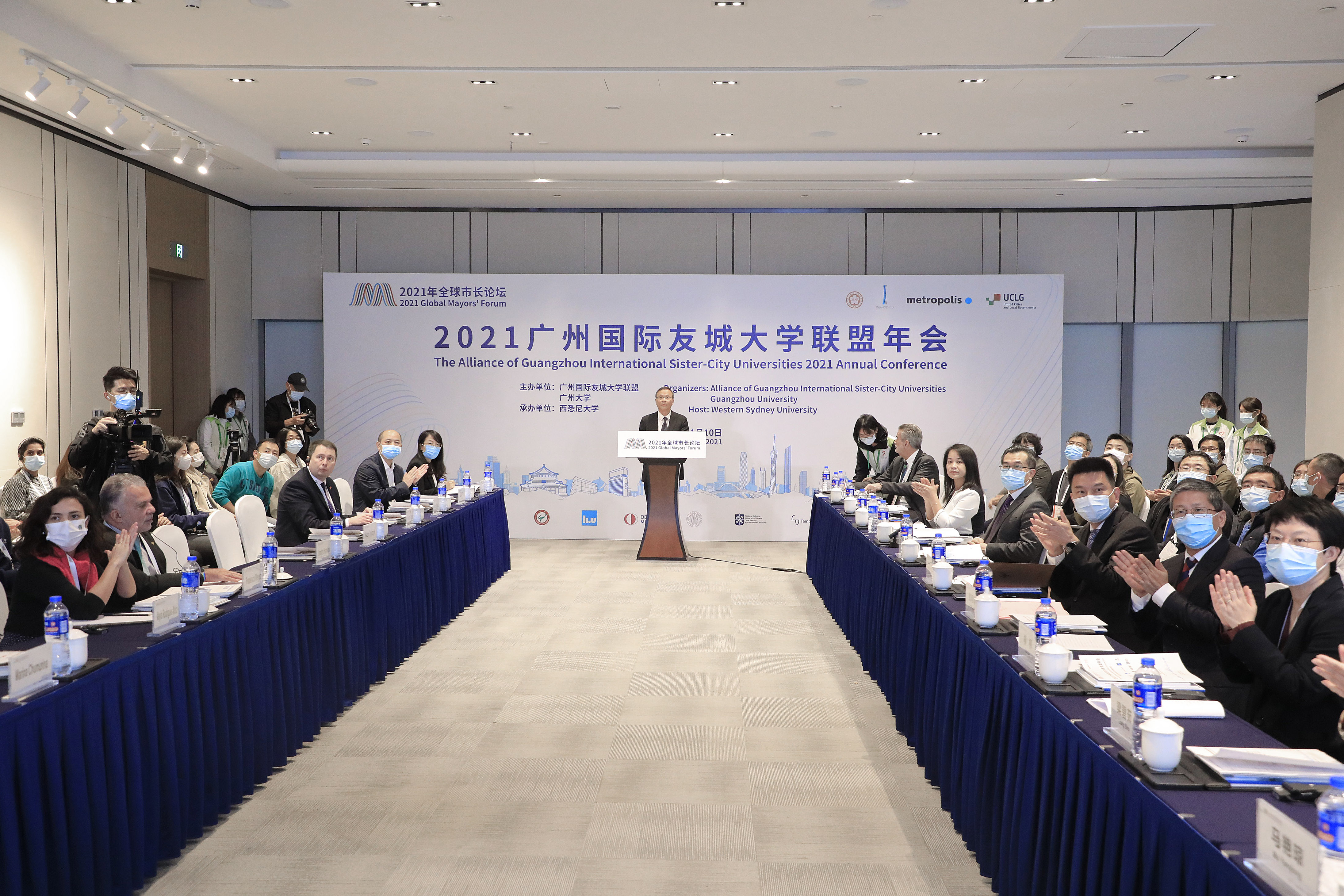 2021广州国际友城大学联盟年会由广州国际友城大学联盟秘书处、广州大学主办,澳大利亚西悉尼大学承办,分别在广州和悉尼两地同时设立线下会场,并作为2021年全球市长论坛系列活动之一。