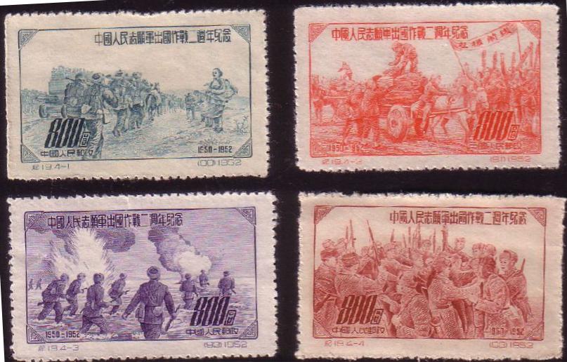 1952年11月25日,为了纪念中国人民志愿军赴朝作战2周年,中华人民共和国原邮电部发行《中国人民志愿军出国作战二周年纪念》邮票1套4枚,邮票内容分别为:一、《志愿军出国作战》,描绘了志愿军步兵和炮兵在出国途中,受到朝鲜老百姓的欢迎和拥护的情景。二、《支援前线》,描绘了中国人民志愿军开赴朝鲜后,中国进行了广泛宣传、动员,刚刚获得解放的老百姓纷纷捐款捐物,支援军队作战的情景。三、《涉江追击》,表现志愿军在战斗中涉水追击敌人的情景。四、《胜利会师》,表现中国人民志愿军和朝鲜人民军会师后的情景。四枚图案具体而形象地表现出了这场战争的时代特征和伟大意义。