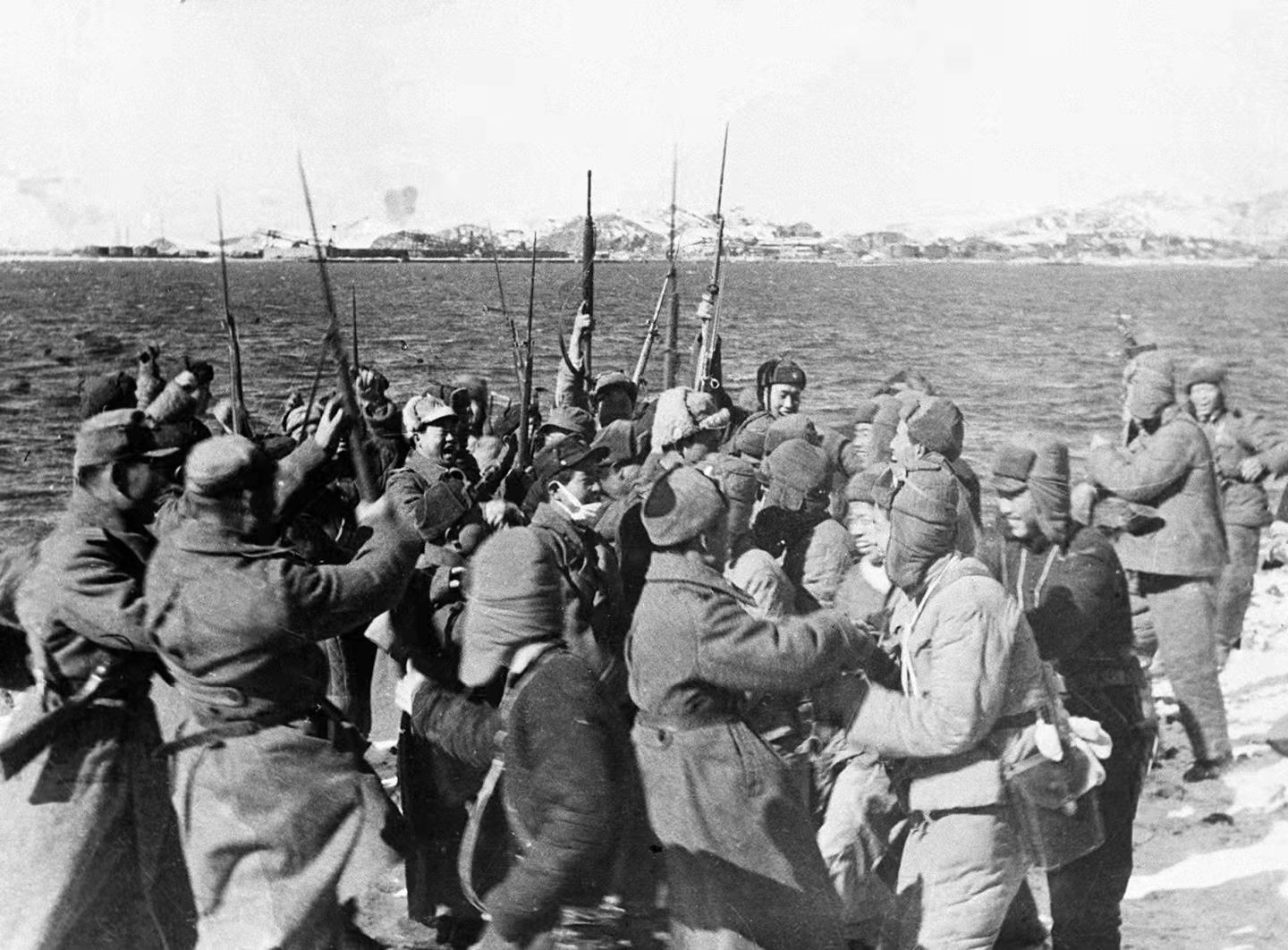 张崇岫透露,为了捕捉到这张照片,他是经过提前构思的。“当年解放战争胜利后,苏联有记者来中国拍照片,我跟着学了不少,他们在上海就拍过这种类似‘胜利会师’的镜头。所以,我知道长津湖胜利后,可能会出现这个场景,就专程赶到咸兴港去。”为了拍下这张照片,张崇岫独自一人冒险在雪地里徒步四五十公里,从早上走到下午,才到达咸兴港边,追上了先头部队。“前方路上有什么危险,我也不知道,当时也算是抱着‘有去无回’的决心去的。”张崇岫“胜利会师”的预判没有错。他看见朝鲜人民军海防部队和志愿军第二十军五十九师侦察连迎面而来,双方胜利会师,场景非常热闹。他不顾疲劳,兴奋地为大家拍照,记录下这珍贵而极具历史价值的画面。而这张底片和照片,也被中国人民革命军事博物馆收藏。