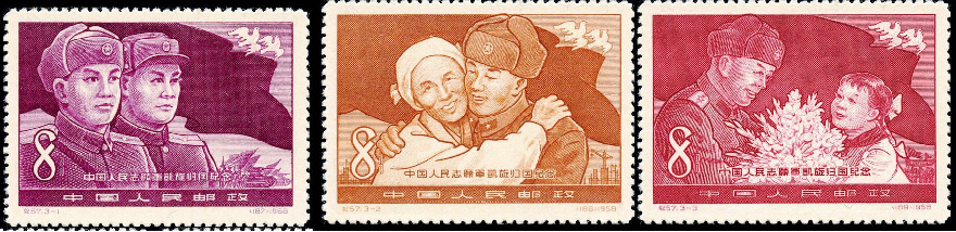 1958年10月20日,为欢迎中国人民志愿军官兵胜利归来,展现志愿军与朝鲜人民军、朝鲜人民在战争中以鲜血凝成的友谊,以及祖国人民对志愿军战士的思念之情,原邮电部发行《中国人民志愿军凯旋归国纪念》邮票1套3枚。2020年10月25日,中国邮政发行《中国人民志愿军抗美援朝出国作战70周年》纪念邮票1套1枚,寓意铭记历史、保家卫国、维护和平。