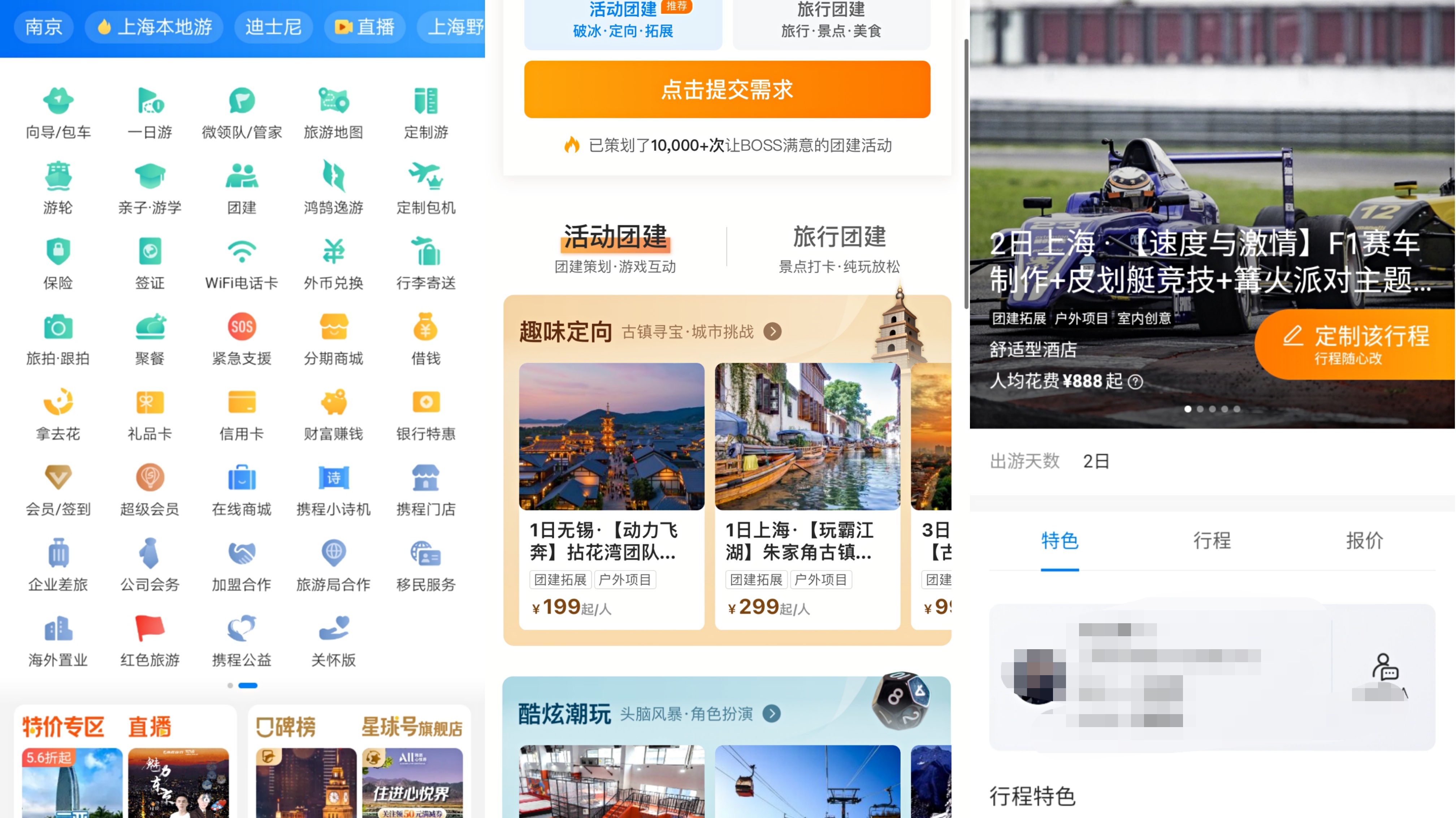 团建内容是否独特,形式是否新颖,产品是否个性化是团建旅游产品的制胜法宝。携程定制团建业务数据显示,定向寻宝、室内冰壶、疯狂原始人、夏季漂流、以及清凉皮划艇,是今年上半年最受年轻人喜欢的TOP5团建玩法。近日,携程定制团建业务进行全面升级与改版,首次在携程APP首页二屏设置“团建”专区入口,并且首次将团建业务划分为趣味定向、酷炫潮玩、主题创意、骑行徒步四大板块供年轻消费者选择。随着定制团建业务的全面升级,团建业务量已经占到携程定制总业务的15%。