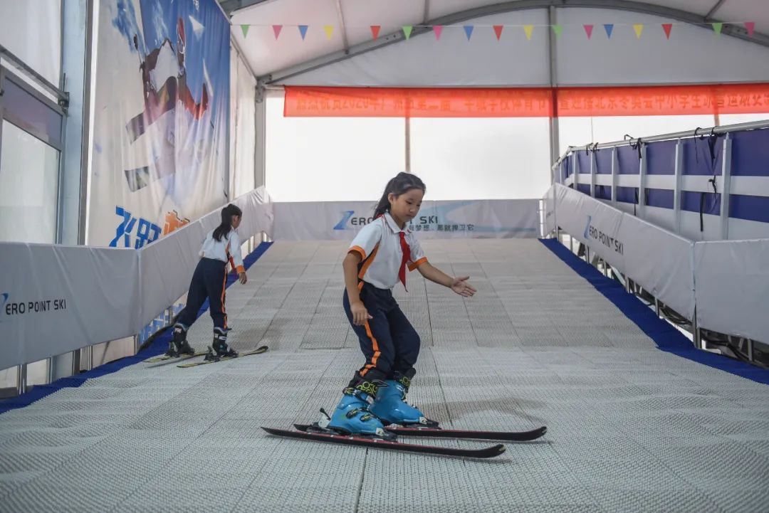 二年级学生窦微茵脚踩双板,膝盖弯曲,从旱雪坡上冲下来,最后定点制控。小小的身板,动作娴熟,丝毫看不出恐惧。窦微茵从一年级下学期开始学滑雪,她说: