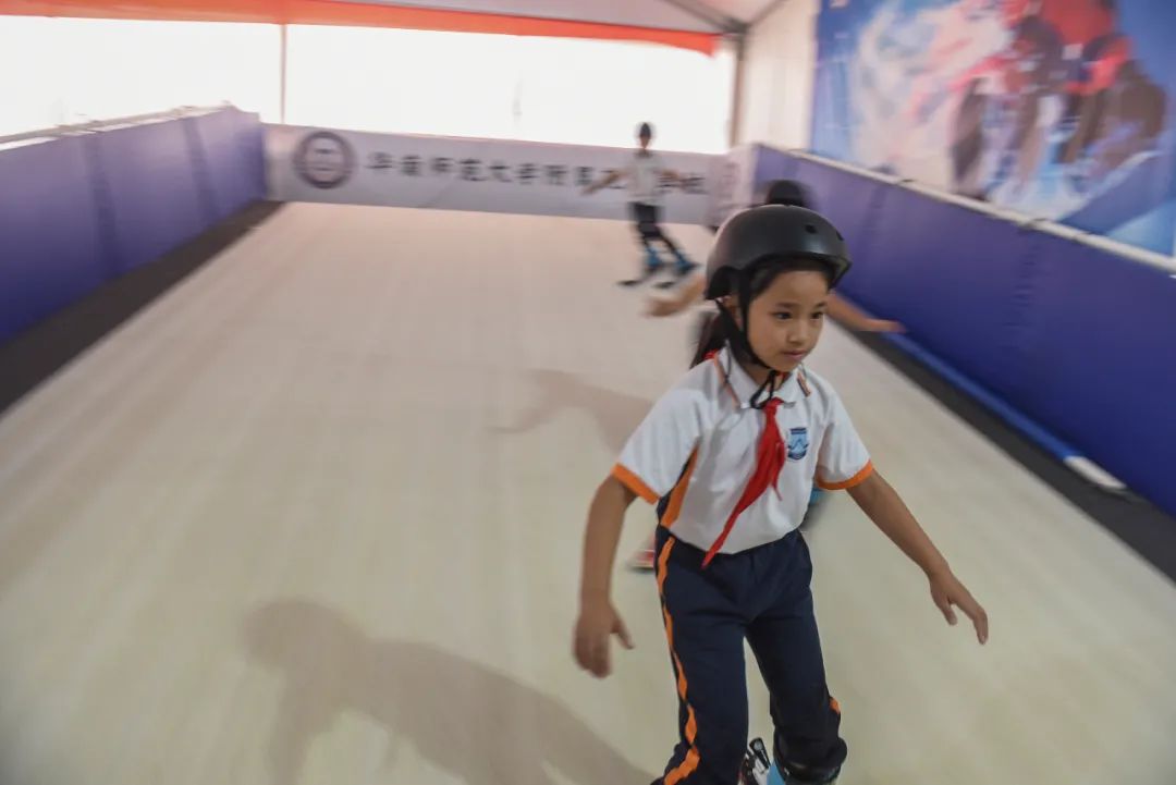 穿上滑板、戴上头盔,走上滑坡和滑雪机,完成直滑降、定点制控、犁式滑行等动作……实在是太帅了!这样的场景,天天出现在华南师范大学附属花都学校(以下简称“花都华附”)。