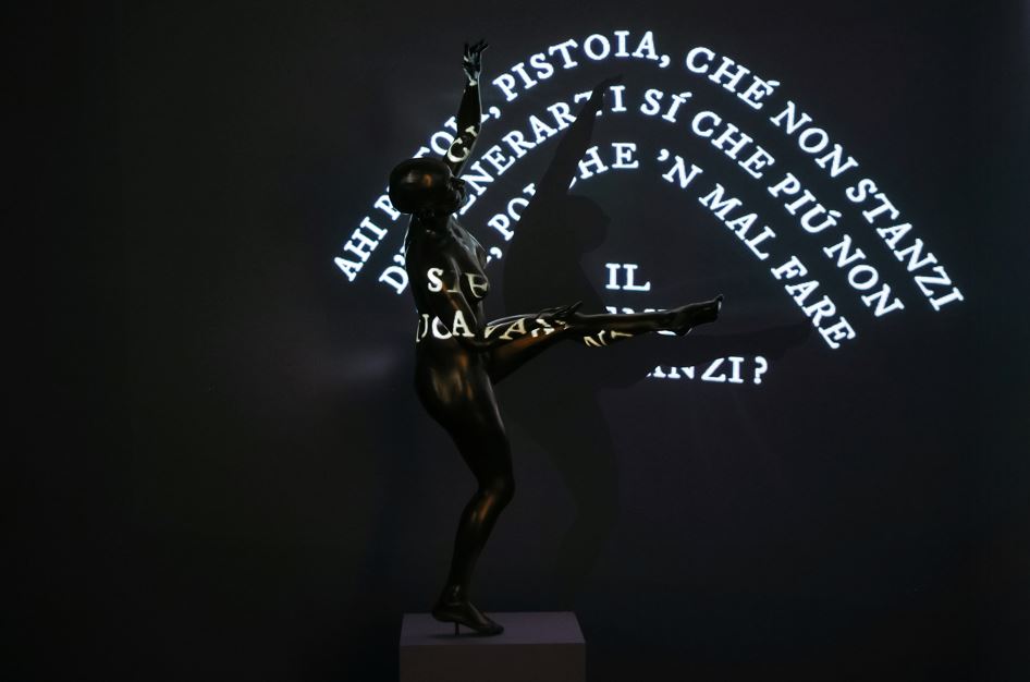 展览从但丁笔下囚禁着罪恶深重的灵魂的“地狱”开始,在瓦伦蒂娜·福瑞安的影像作品《恰科》中,营造出沉浸式的暗黑氛围体验。但艺术亦赋予了希望的可能。在马里内拉·塞纳托雷的《攀登星辰》中,但丁的叙述被大胆的重新诠释,大恶人渎圣者万尼·符契的灵魂在艺术家的想象中得到救赎。
