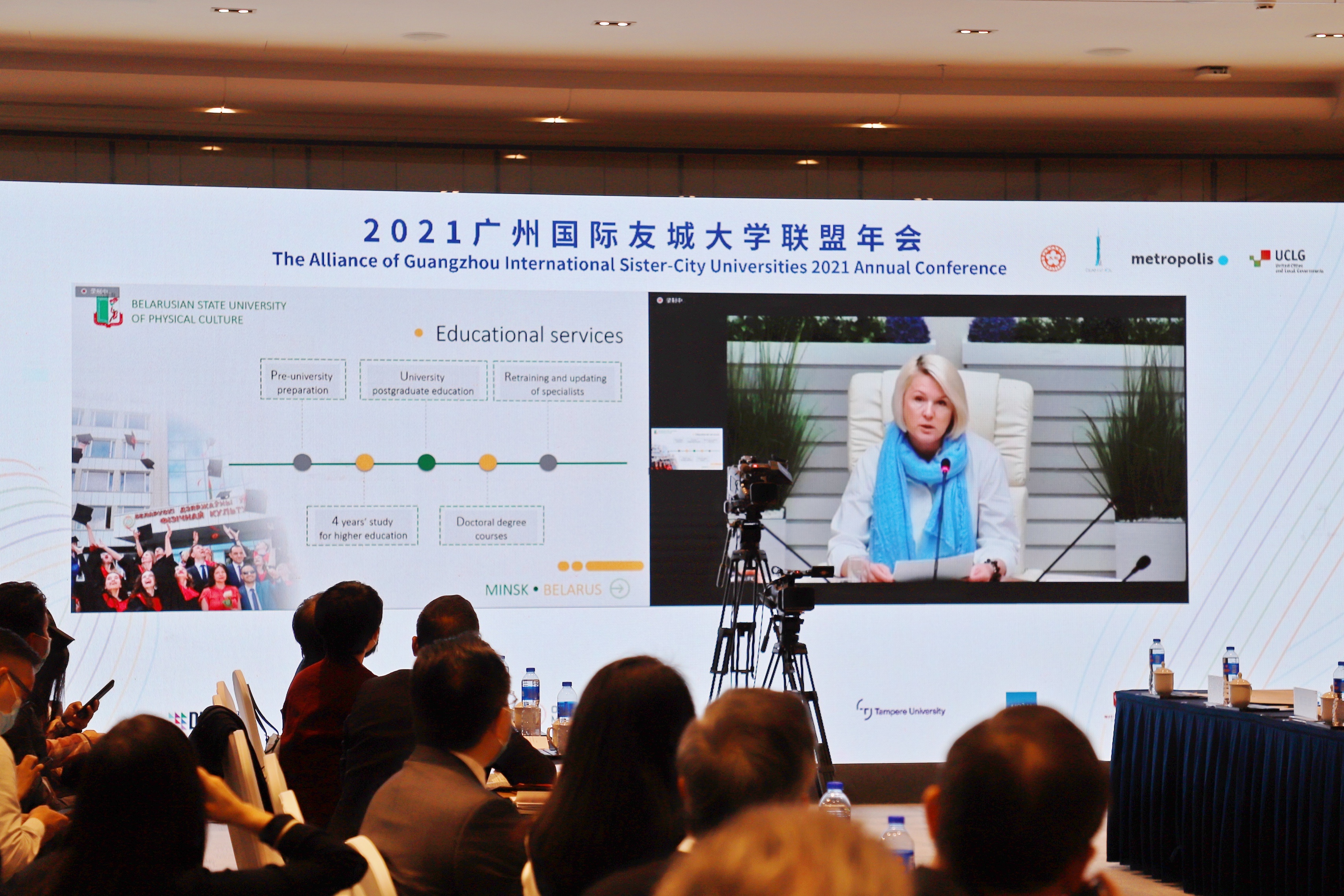 广州国际友城大学联盟主席、广州大学校长魏明海教授致辞并作联盟2021年工作报告。通讯员供图
