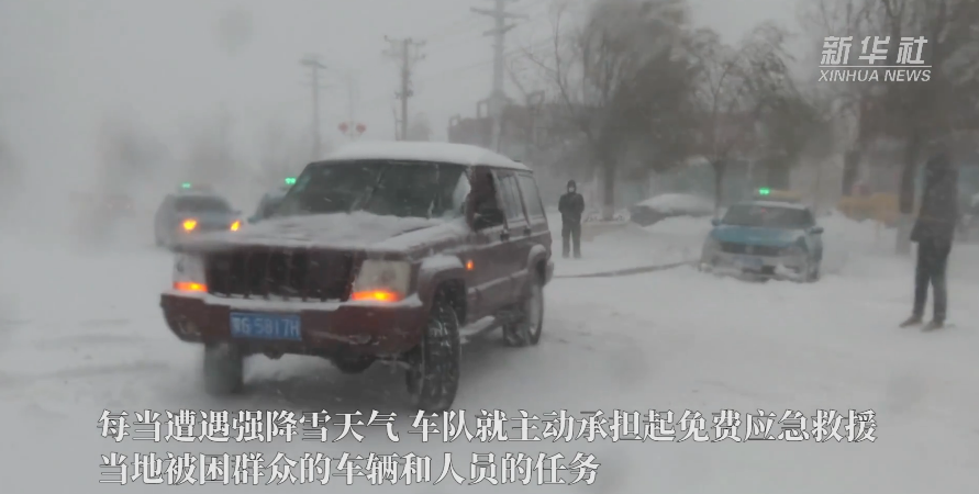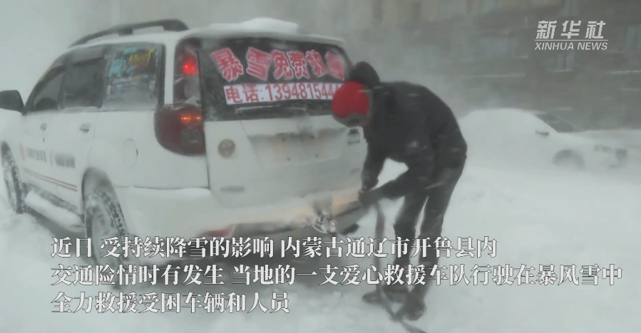 内蒙古通辽市开鲁县各个街道被厚厚积雪所覆盖,积雪深度达到20厘米以上,多辆车被困道路中央无法动弹。在暴风雪中,一支爱心救援车队全力救援受困车辆和人员。