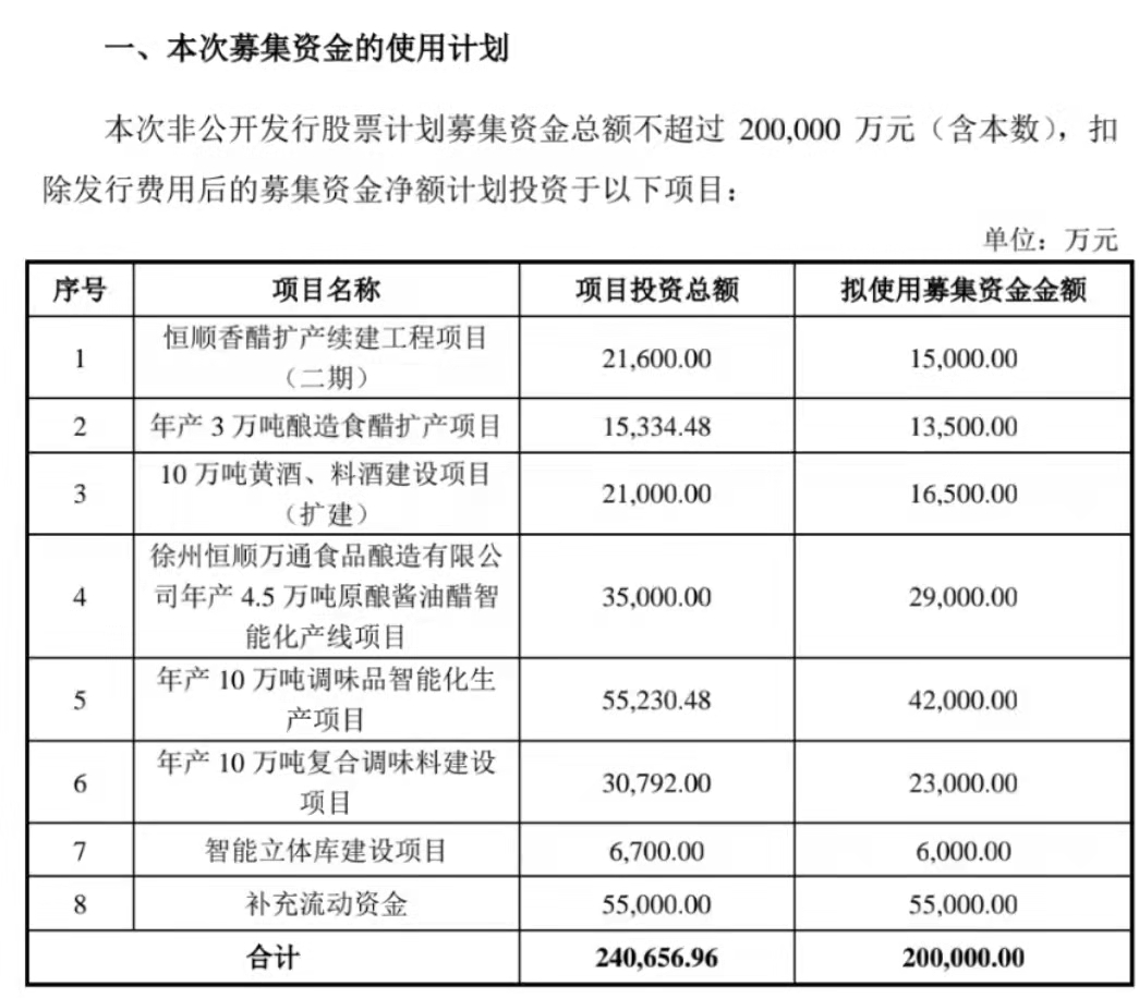 根据最新募资公告,恒顺醋业本次非公开发行股票的发行对象为不超过35名的特定投资者,计划募集资金总额不超过20亿元,拟投资八大项目:恒顺香醋扩产续建工程项目(二期)、年产3万吨酿造食醋扩产项目、10万吨黄酒、料酒建设项目(扩建)、徐州恒顺万通食品酿造有限公司年产4.5万吨原酿酱油醋智能化生产线项目、年产10万吨调味品智能化生产项目、年产10万吨复合调味料建设项目、智能立体库建设项目、补充流动资金。