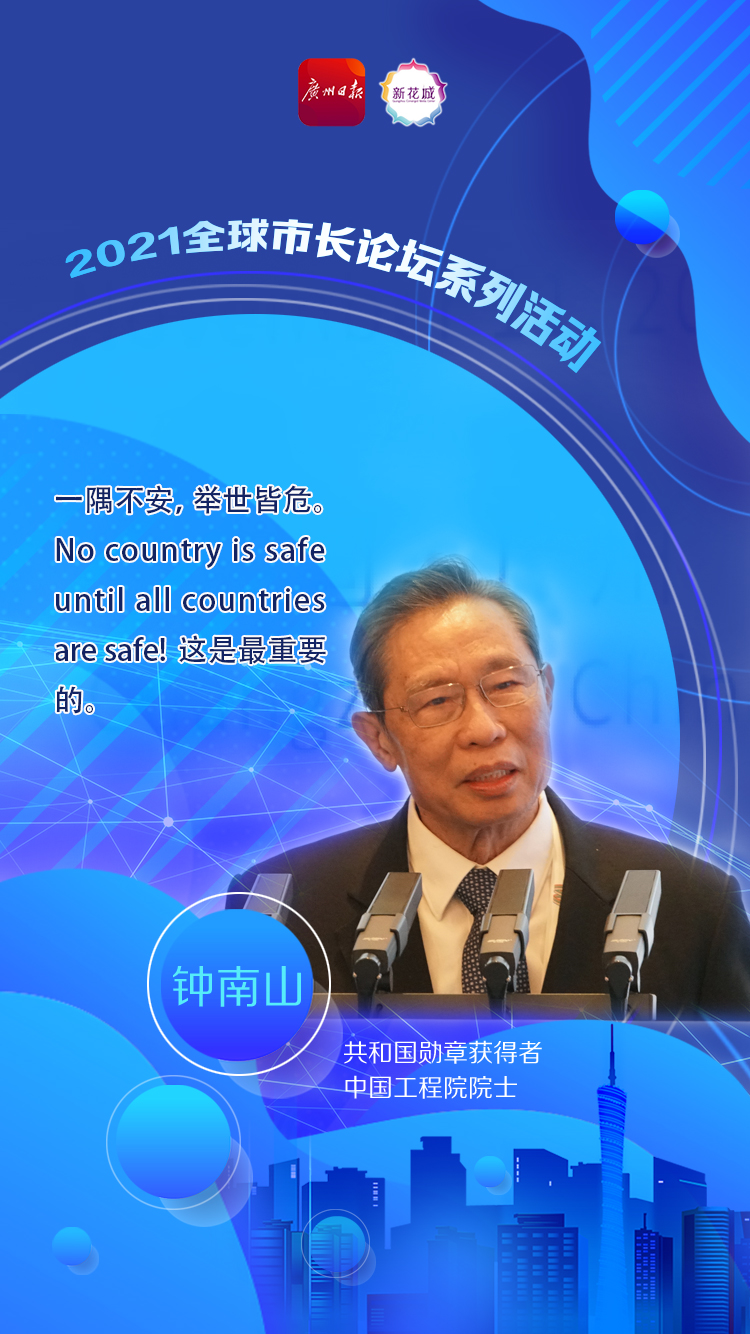 11月11日晚,2021年全球市长论坛全体大会在广州越秀国际会议中心举行。共和国勋章获得者、中国工程院院士钟南山作专题演讲,分享战“疫”中的广州经验和广州做法。