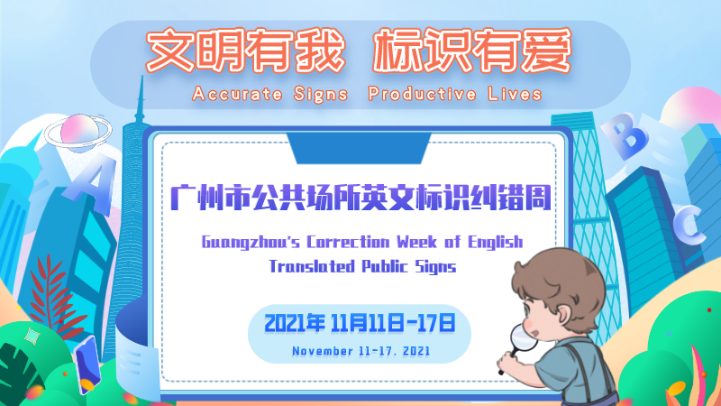 11月11日-17日,广州市委外办和广州市文明办将联合举办“文明有我,标识有爱”广州市公共场所英文标识纠错周活动。诚邀广大市民助力,一同深化广州文明城市创建,为城市公共环境优化贡献智慧。