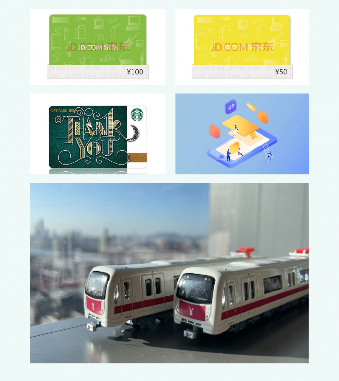 手机话费充值、京东购物卡、星巴克实体储蓄卡、广州地铁列车车模。