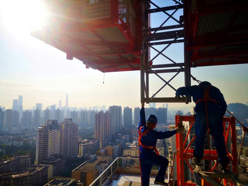最高效的垂直运力系统。为满足超高层建设垂直运输需要,项目采用国家“十三五”重点研发课题,深圳市“十三五”工程建设领域,科技重点计划(攻关)项目——中建三局自主研发的单塔多笼循环运行施工电梯技术,为项目施工带来了极大便利。
