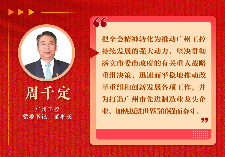 接下来,我们将把学习贯彻落实全会精神作为当前一项重要的政治任务,将全会精神转化为推动广州工控持续发展的强大动力,坚决贯彻落实市委市政府的有关重大战略重组决策,迅速而平稳地推动改革重组和创新发展各项工作,并为打造广州市先进制造业龙头企业、加快迈进世界500强而奋斗。