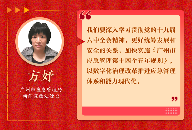 我们要深入学习贯彻党的十九届六中全会精神,下一步,要更好统筹发展和安全的关系,加快实施《广州市应急管理第十四个五年规划》,以数字化治理改革推进应急管理体系和能力现代化,对标对表从根本上消除事故隐患、从根本上解决问题。