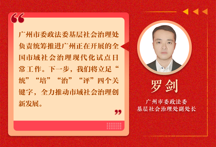 我所在的市委政法委基层社会治理处,负责统筹推进广州正在开展的全国市域社会治理现代化试点日常工作。我们立足广州作为国家中心城市的省域“首位度”,全力打造市域社会治理现代化示范城市。突出党建引领“主旋律”,立项培育创新项目98个,评选年度十大创新项目。突出风险管控“主防线”,创新新时代群防共治新模式,全面建设城市最小应急处置单元。突出基层基础“主阵地”,推进“综治中心+网格化+信息化”建设,建成四级综治中心2958个。突出民主协商“主窗口”,搭建“有事好商量”协商平台,全部村(居)建立村(居)民议事厅。