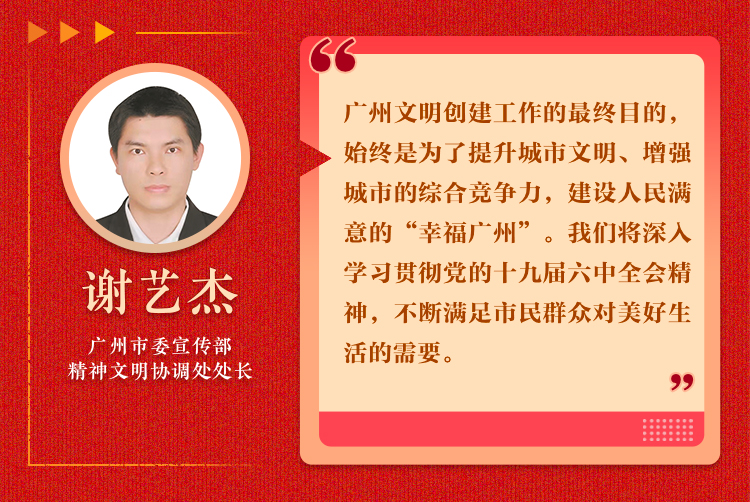 以市民身边的新时代文明实践阵地建设工作为例,目前,广州已建成2852个新时代文明实践中心(所、站),累计开展线下活动5.1万场(次),惠及群众978万人次,推出“文明实践云”,实现网上网下同频共振,构筑起一个“全市覆盖、出户可及、群众便利”的服务网络。接下来,我们将深入学习贯彻党的十九届六中全会精神,积极整合党群服务中心、政务服务中心、网格综治中心等资源,探索“所站+驿站”的阵地模式、“线上+线下”的传播模式、“社工+志愿者”的服务模式、“主题月+实践日”的活动模式,精准化开展“百姓点单、中心派单、志愿者接单”的文明实践志愿服务,不断满足市民群众对美好生活的需要。