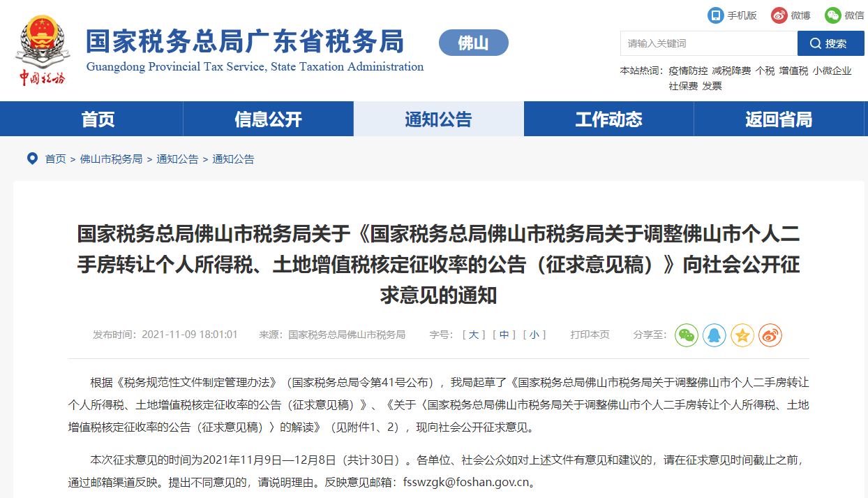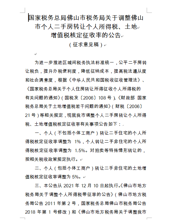 日前,国家税务总局佛山市税务局发布《国家税务总局佛山市税务局关于调整佛山市个人二手房转让个人所得税、土地增值税核定征收率的公告(征求意见稿)》向社会公开征求意见的通知。
