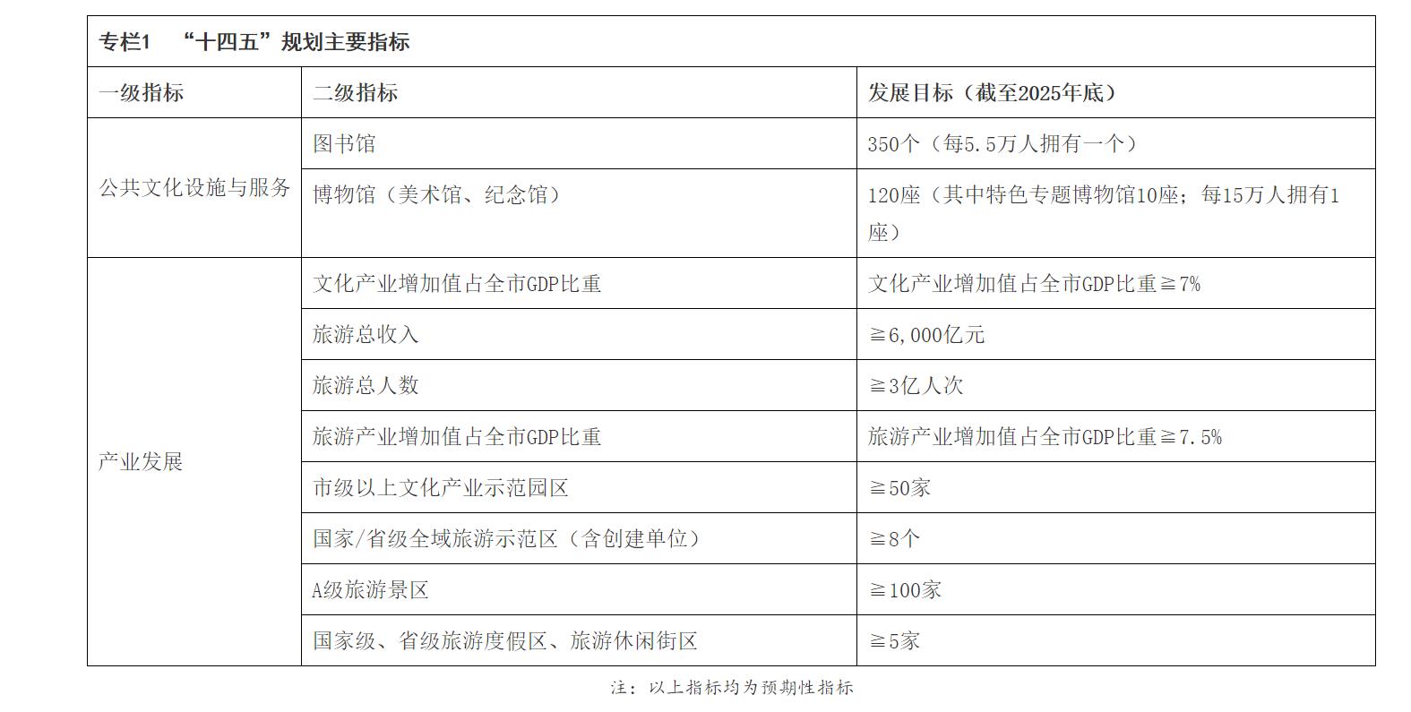 《规划》提出了“十四五”主要任务及项目库共138项。在建设“世界文化名城”方面,《规划》提出力争到“十四五”期末,繁荣发展文化事业和文化和旅游产业,擦亮红色文化、岭南文化、海丝文化、创新文化品牌,传承城市文脉,留住城市记忆,彰显城市精神,激发城市活力,提高城市文化软实力,助推广州城市高质量发展,突显广州“岭南文化中心”“英雄城市”“海丝枢纽”“创新之都”“美食之都”“美丽花城”“千年商都”等城市形象,推动广州文化和旅游发展再创辉煌。到2025年,力争广州基本实现打造社会主义文化强国的城市范例。
