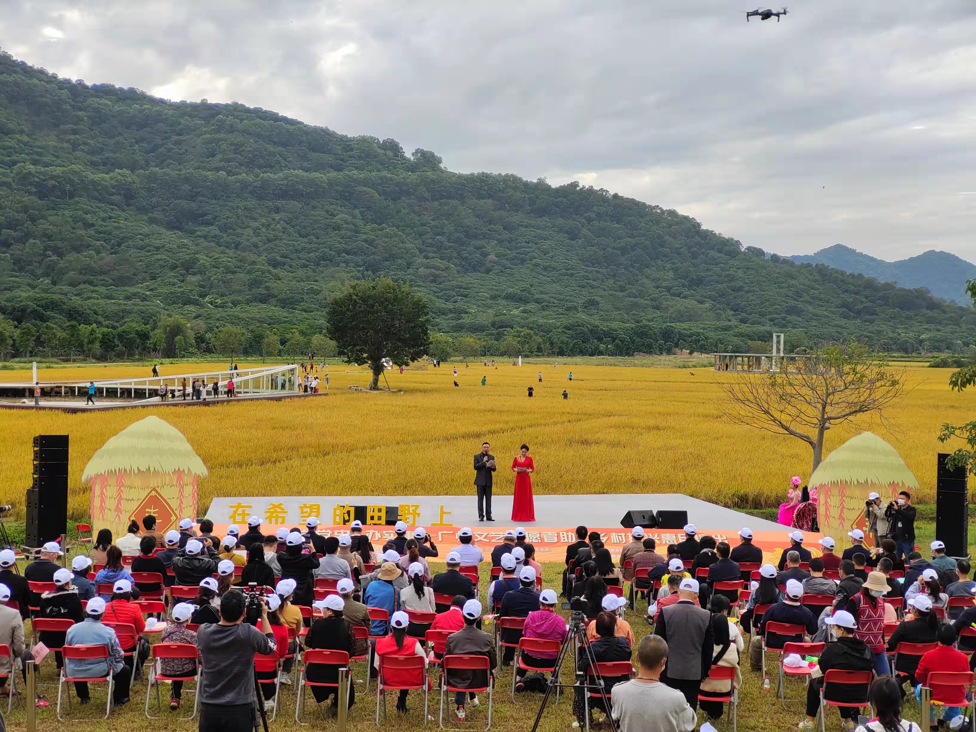 11月12日,广州市文联、广州文艺志愿者协会、从化区文联联合举办的“在希望的田野上”学党史、办实事——广州文艺志愿者助力乡村振兴惠民演出活动在从化艾米稻香农业公园精彩上演。在金灿灿的稻田里,以精彩演出映衬稻香,是为乡村振兴鼓与呼的另一种打开方式。