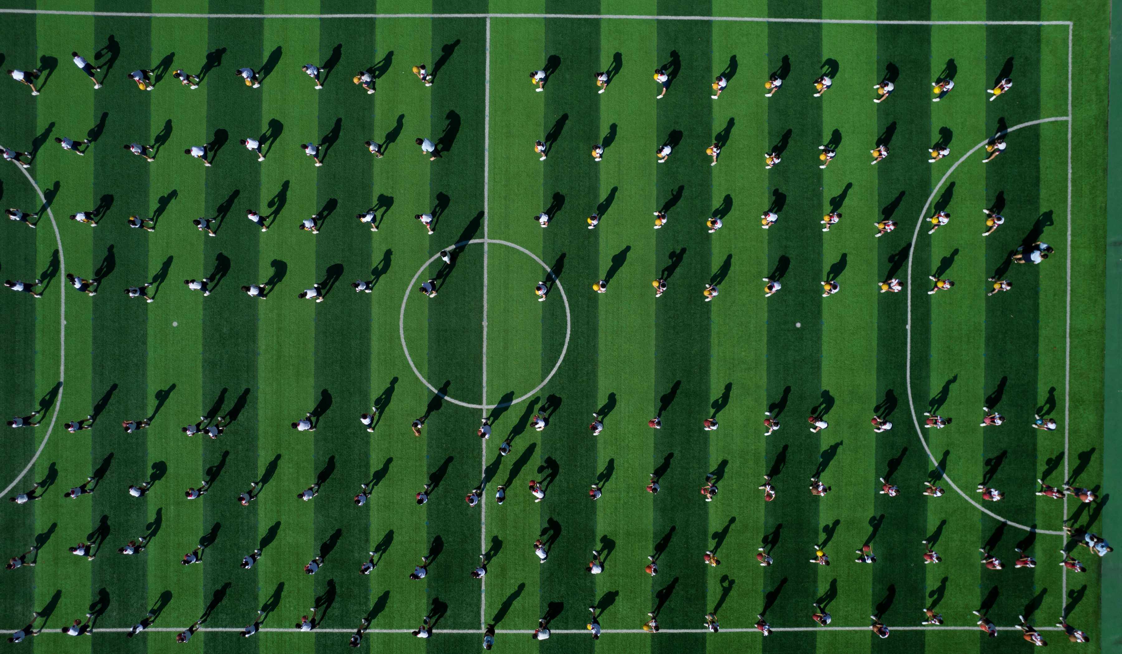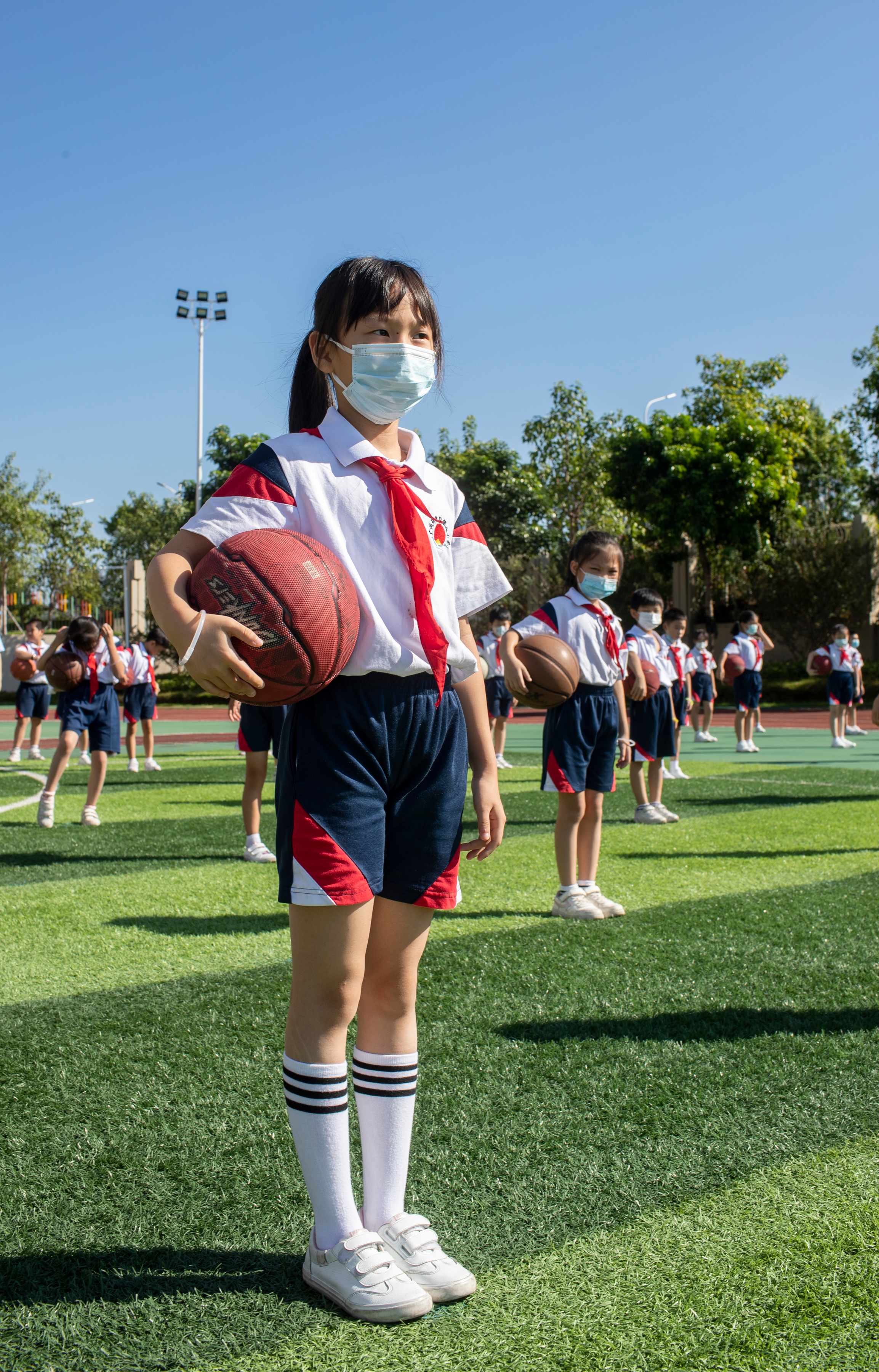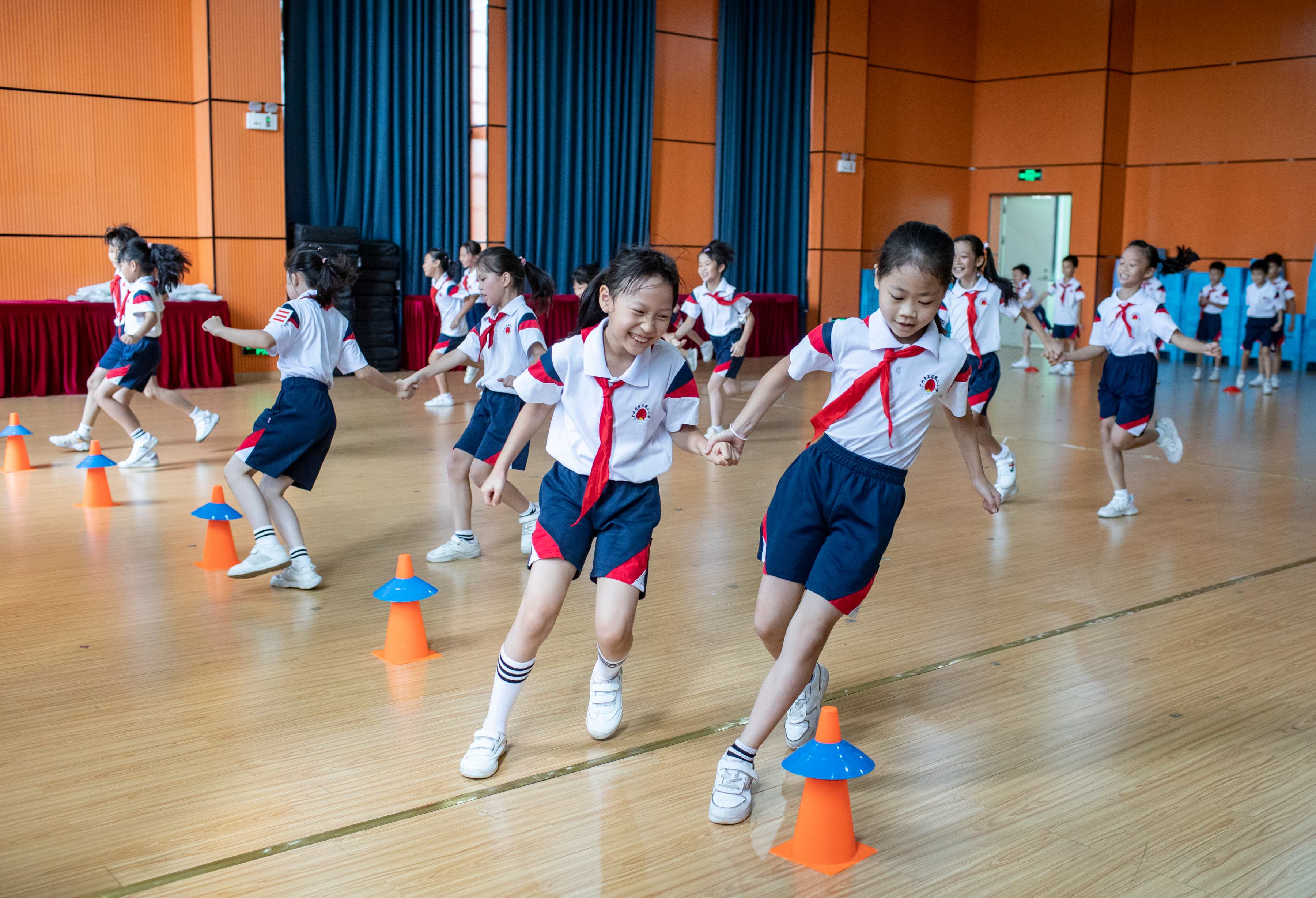 大课间时间到了 体育场上 学生集体拍球击地的声音响亮 几百人相互传接球、运球 之后是体育课 在体育老师指导下 思含和同学一起折返跑、做篮球操 校内一小时体育活动在欢笑声中达成