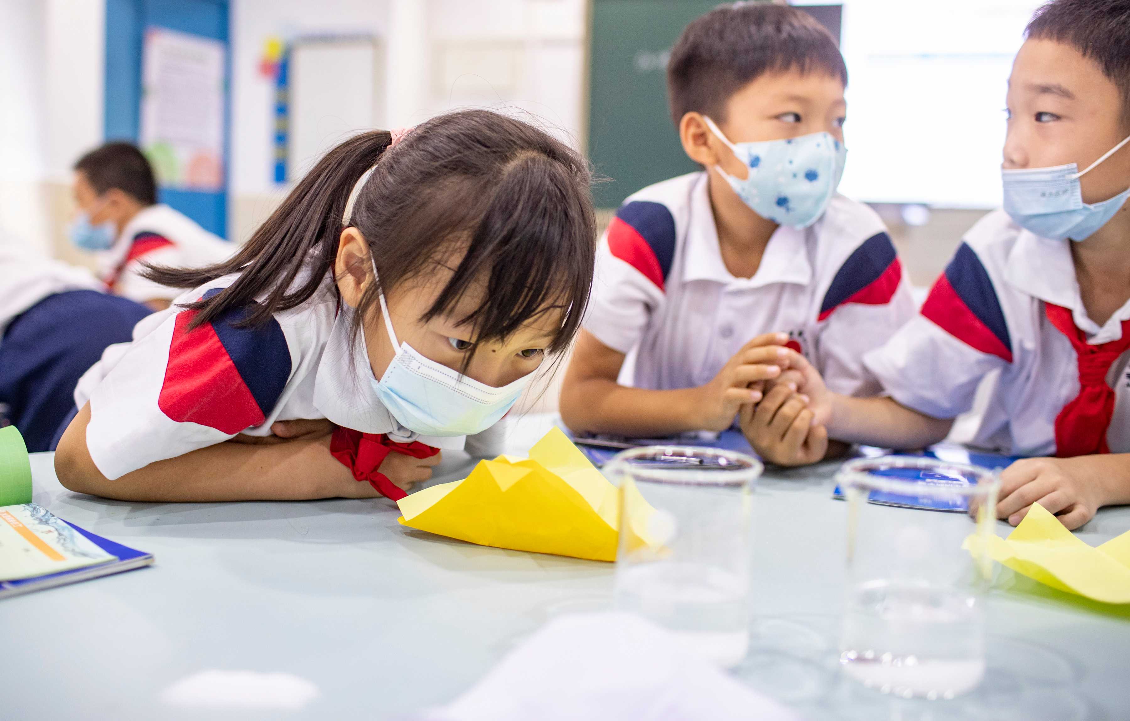 14:00 学生起床收拾进行午读 科学课上 同学们在老师指导下做实验 思含搅动着吸管 观察盐在搅拌下如何加快溶解